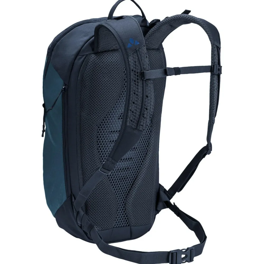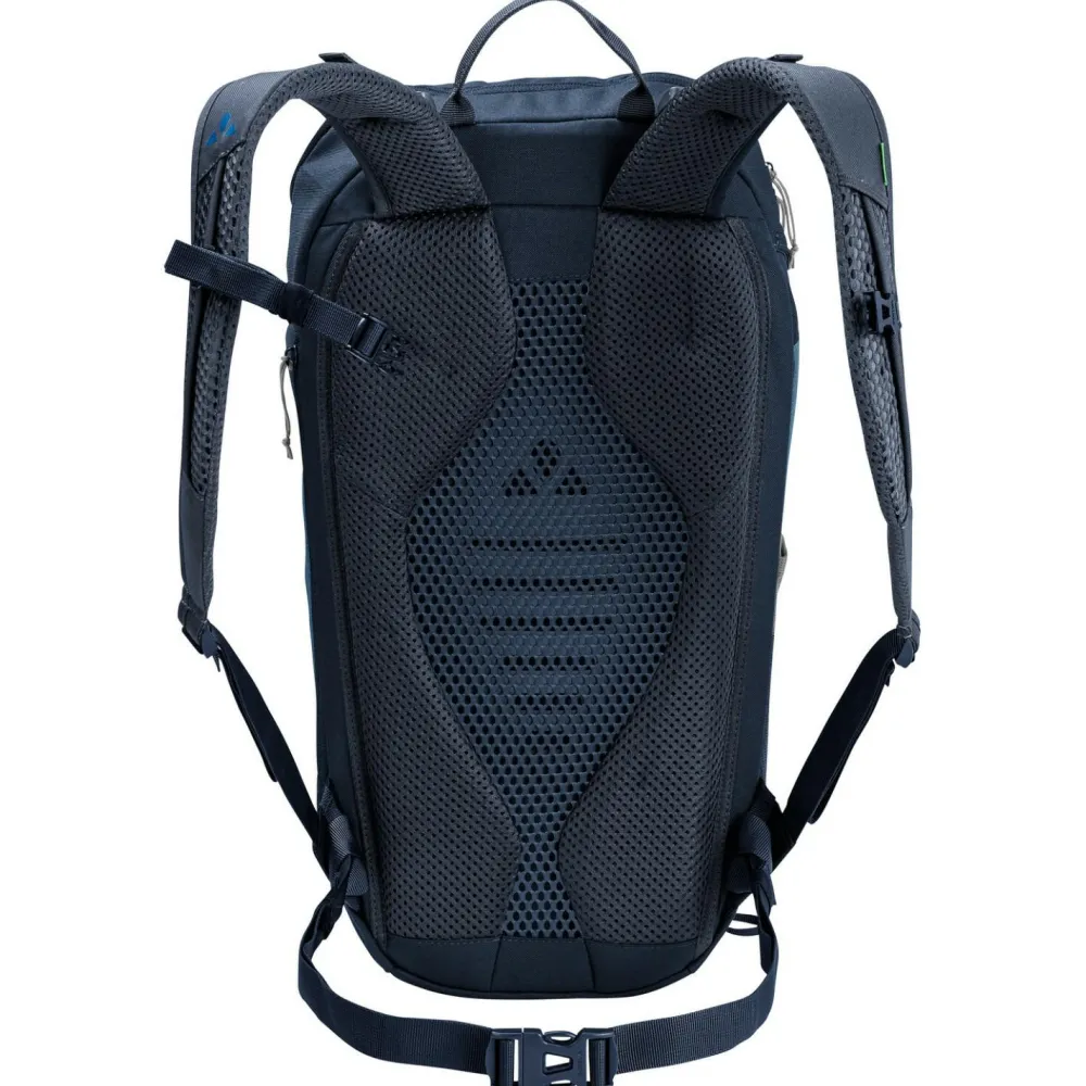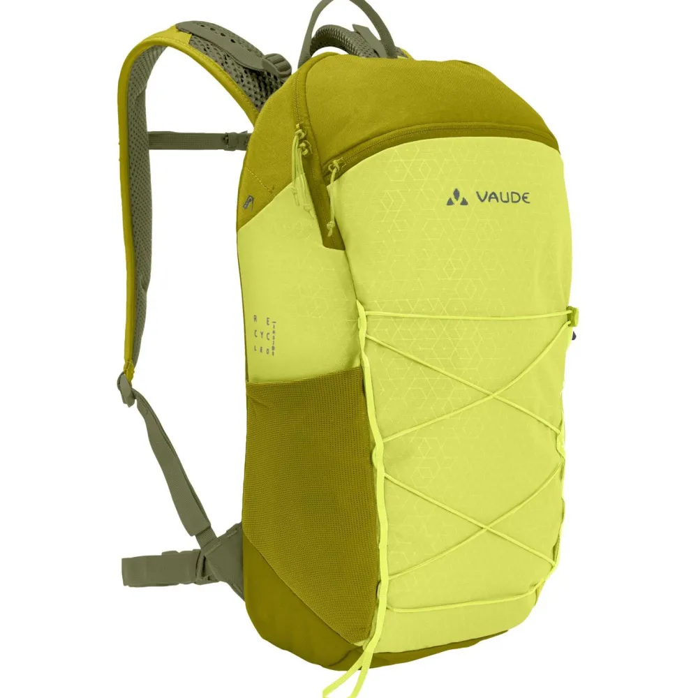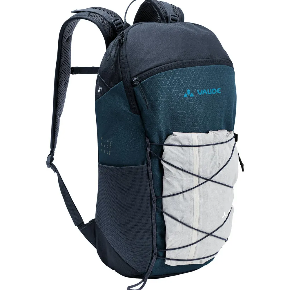 Mit 20 Liter Volumen bietet der Agile 20 Wanderrucksack von Vaude genügend Platz für Vesper, Bekleidung und Wanderutensilien. Der schmal geschnittene Daypack verfügt über ein großes Hauptfach und ein extra Frontfach mit Reißverschluss. Außerdem ergänzen eine frontale Gummizughalterung, eine seitliche Stretch-Tasche und eine Stockhalterung den sportlichen Tagesrucksack. Der Agile 20 sitzt bequem am Rücken und sorgt mit den gepolsterten und ergonomisch geformten ErgoShape Schultergurten für angenehme Bewegungsfreiheit. Schmale Gurte aus Gurtband an der Brust und an der Hüfte ergänzen das Tragesystem. Bei Bedarf kann der Hüftgurt außerdem entfernt werden. Vaude fertigt den kompakten Wanderrucksack fast vollständig aus umweltfreundlichem Recyclingmaterial.
