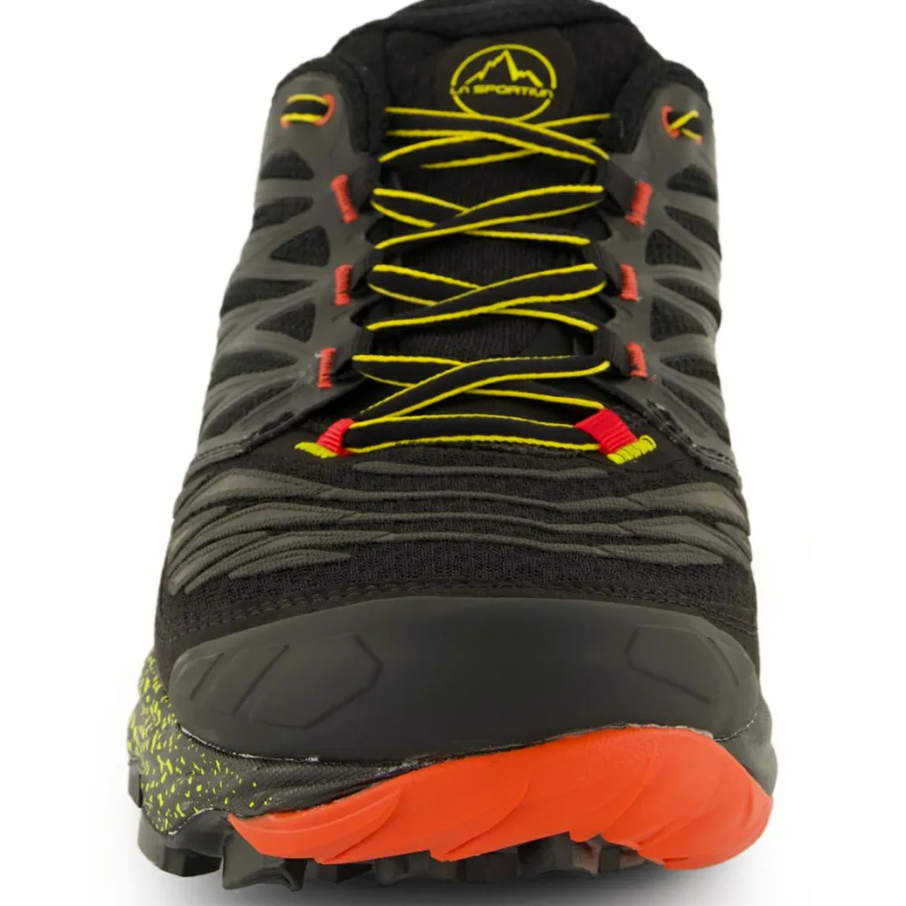 Für intensive Trainingseinheiten ist der Trailrunningschuh Akasha II von La Sportiva der richtige Partner! Sein Obermaterial ist atmungsaktiv und lässt Dampf schnell entweichen. Das Exoskelett gibt Deinem Fuß die nötige Stabilität. Mit der dämpfenden Laufsohle und der stabilisierenden Platte hast Du den optimalen Laufkomfort für längere Distanzen. Das natürliche Abrollverhalten wird optimal unterstützt. Mit den multidirektionalen Stollen der Laufsohle hast Du einen hervorragenden Grip und gleichzeitig einen dynamischen Abdruck nach vorne. Die Zehenschutzkappe ist für Geröll vorteilhaft. Ein leichter, dynamischer Schuh für anspruchsvolle Strecken!