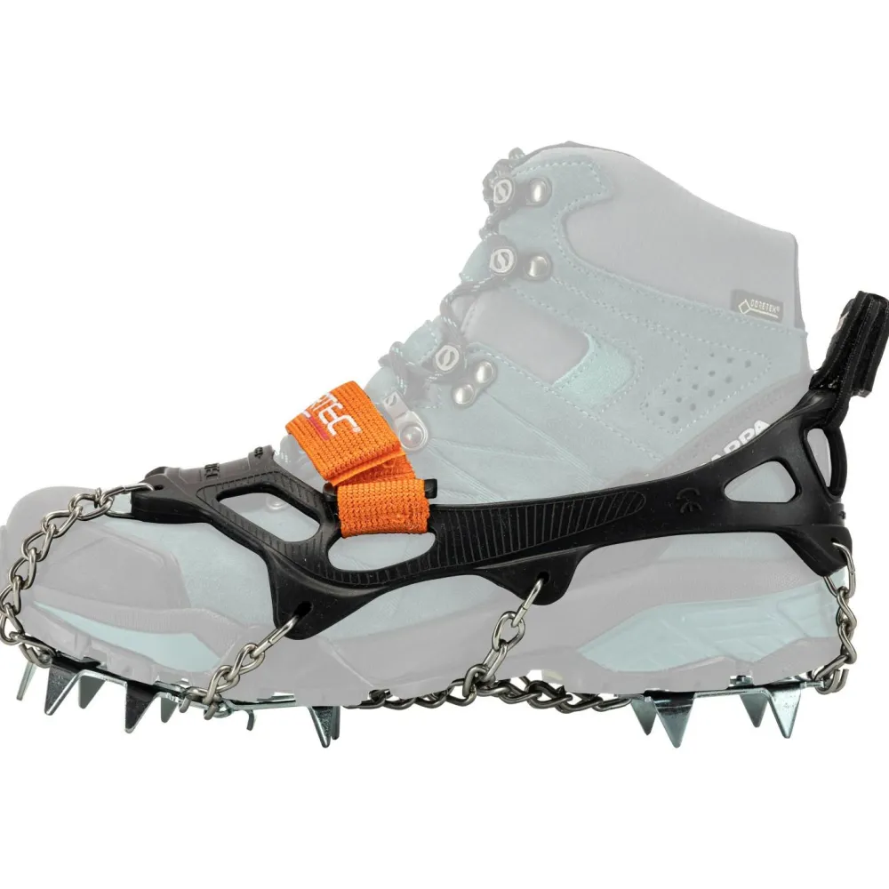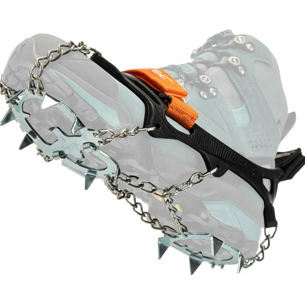 Dank des Quick-fit Systems und dem Puller lassen sich die Grödel schnell und einfach über die Schuhe ziehen. Dank zusätzlichem Klettverschluss sitzen die Grödel perfekt am Schuh! Der Frontbügel auf der Schuhspitze liefert beim Gehen noch mehr Stabilität. Die vorderen Steigeisen sind abgegliedert, damit Schneeansammlungen und die Bildung von Eisklumpen unter den Schuhen verringert werden.