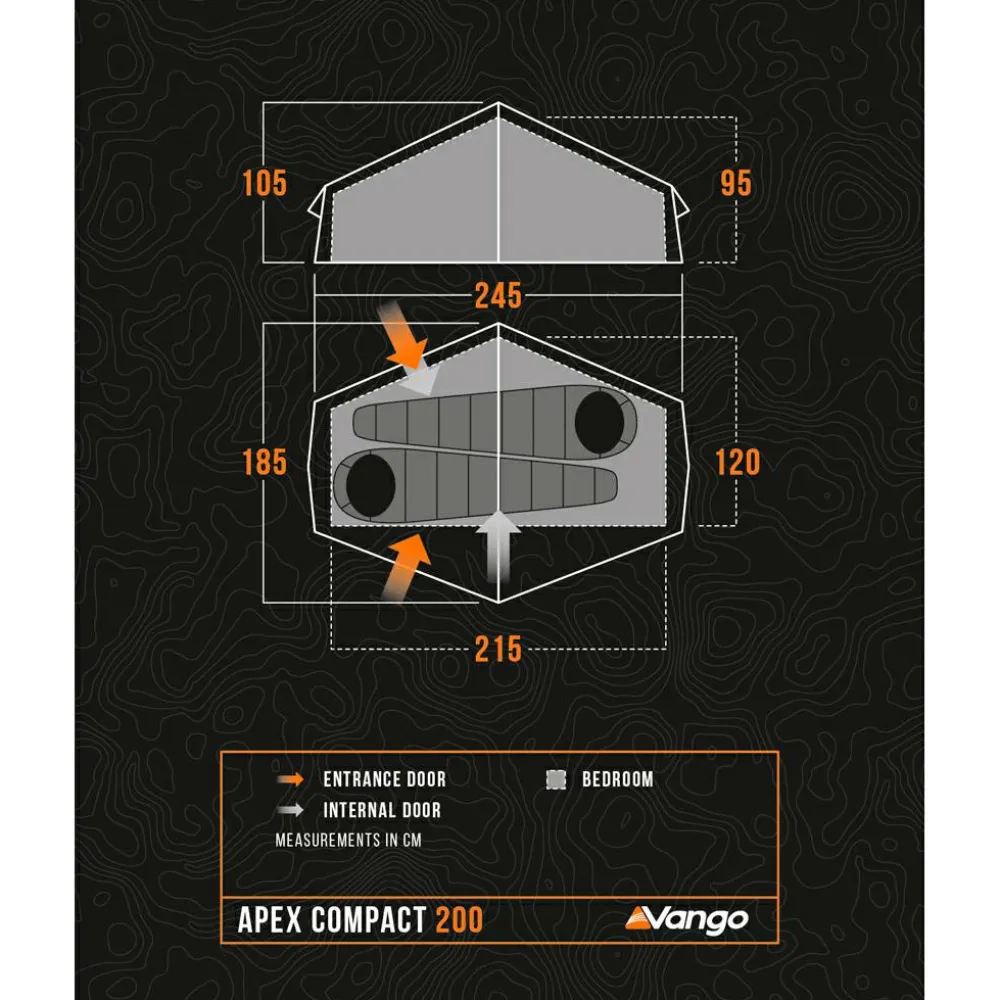 Das Apex Compact 200-Zweipersonen-Zelt von Vango ist die ideale für alle, die gerne mit leichtem Gepäck auf Erkundungstour gehen, sei es beim Trekking oder beim Bikepacking. Entwickelt für Abenteurer, die ein kompaktes, hochwertiges und leichtes Zelt benötigen, bietet es optimalen Schutz und Komfort bei geringem Gewicht und kleinem Packmaß, sodass es leicht und einfach zu transportieren ist. Wenn Du mit dem Fahrrad unterwegs bist, kannst Du das Apex Compact 200 an Deinem Fahrradlenker befestigen.