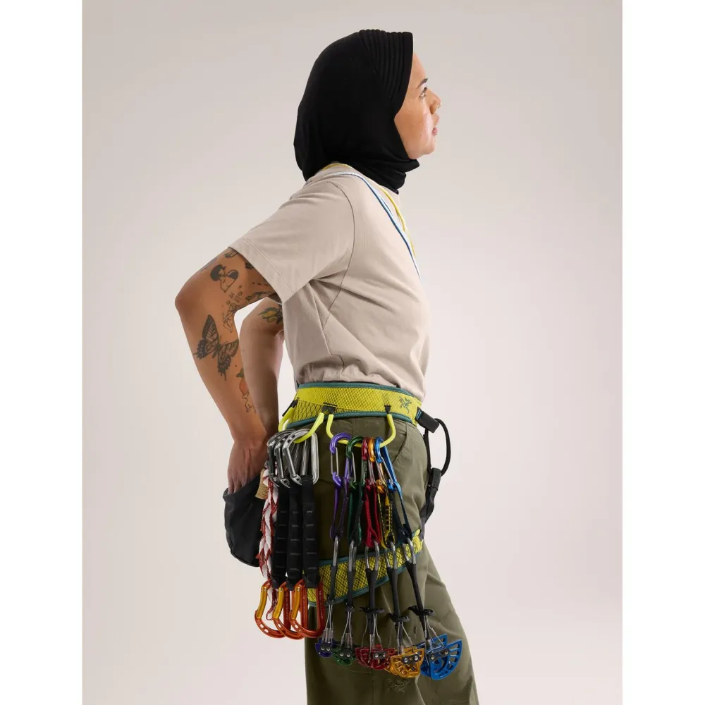 An den Beinschlaufen des Women’s Skaha Harness von Arc’teryx ist keine Verstellmöglichkeit angebracht, was die uneingeschränkte Beweglichkeit bei anspruchsvollen Manövern in der Wand durch elastische Eigenschaften unterstützt. Der Frauen-spezifische Schnitt sorgt für noch mehr Tragekomfort. Um den Gurt schnell ausziehen zu können, ist im hinteren Bereich ein einfach zu lösender Haken angebracht. Die vier robusten Materialschlaufen bieten genügend Platz für Express-Schlingen und Karabiner, die in der Wand schnell griffbereit sein müssen.