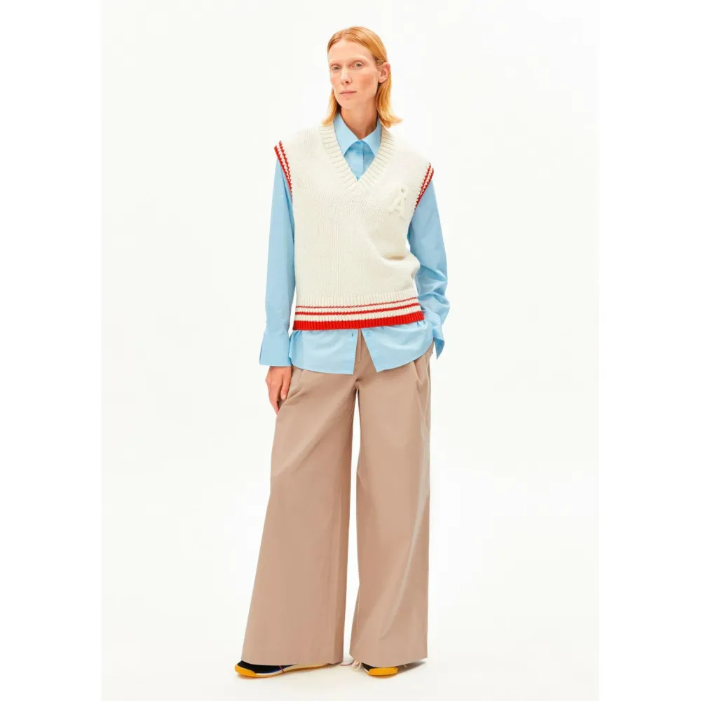 Du kannst den Pullover über einem T-Shirt oder Longsleeve tragen. Damit ist er ein echter Allrounder für viele unterschiedliche Unternehmungen. Ein Pullover, der alle Blicke auf sich zieht – der Women’s Iconic Å College Knit Vest von ARMEDANGELS.