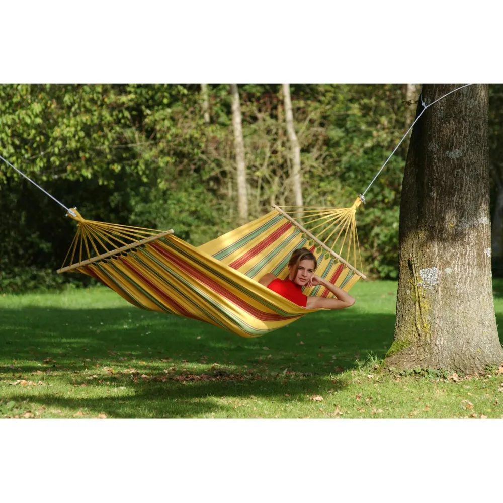 Der Holzstab außen stabilisiert die Aruba Hängematte in ihrer Breite. So kannst Du entspannt auch mit mehreren Personen in der Hängematte abhängen und den Sommer genießen.