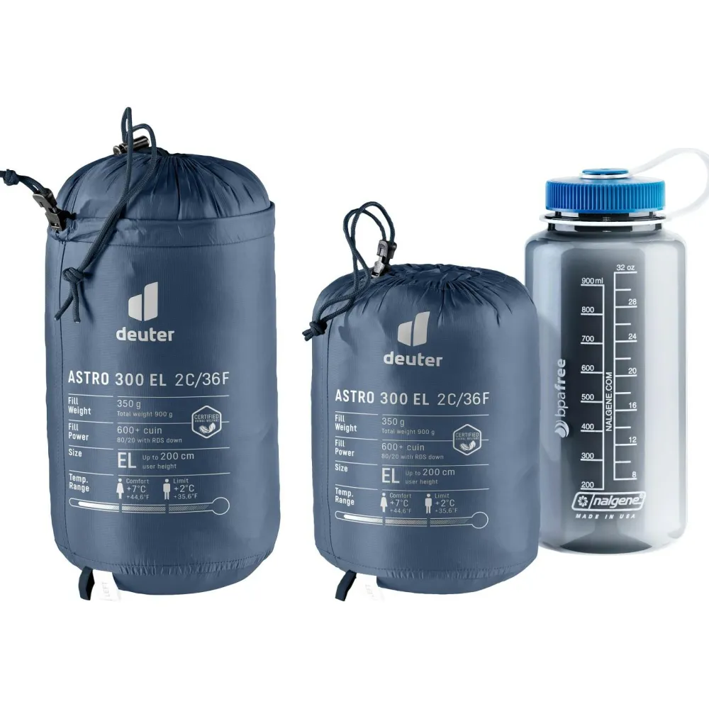 Der Astro 300 EL von Deuter ist der perfekte Daunenschlafsack für groß gewachsene Outdoorer, die ihr Gepäck mit einem warmen und dennoch leichten Schlafsack kompakt halten wollen. Seine hochwertige Daunenfüllung bietet eine hohe Fillpower und sorgt dank der effizienten Verteilung in einer Trapez-Kammerkonstruktion für eine zuverlässige 360°-Isolation ohne Kältebrücken. Hinzu kommt der robuste und komfortable Bezugsstoff, der mit einer PFAS-freien Imprägnierung gegen Wasser und Schmutz ausgestattet ist.