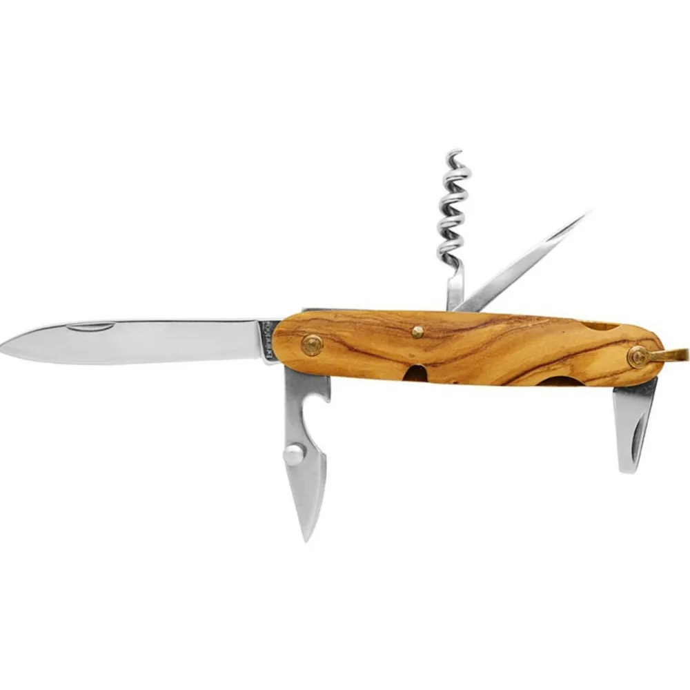 Das Taschenmesser Volga von Baladéo ist aus hochbeständigem Edelstahl (2CR13) gefertigt. Der Griff ist aus edlem Olivenholz und vergoldete Nieten. Es ist mit sechs Funktionen ausgestattet: Messer, kleine Taschenmesserklinge, Flaschenöffner, 4-mm-Flachschraubendreher, Locher, Korkenzieher mit 5 Spiralen und einem Messingbügel.