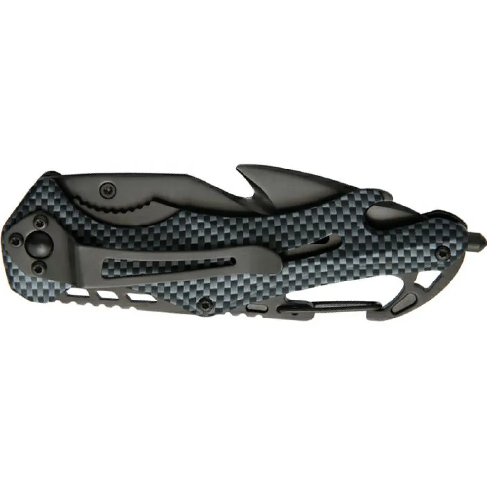 Das Rettungsmesser Emergency von Baladéo hat eine halbseitig gezahnte Klinge aus Edelstahl mit Titanbeschichtung. Für Notsituationen bietet dieses Messer drei Funktionen: einen Gurtschneider, einen Seilschneider und einen Scheibenzertrümmerer. Außerdem ist das Messer mit einem Flaschenöffner ausgestattet. Durch die Sicherheitssperre Liner Lock lässt sich das Messer mit einer Hand öffnen und schließen. Eine Gürtelschnalle und ein integrierter Karabinerhaken sind ebenfalls am Messer vorhanden.