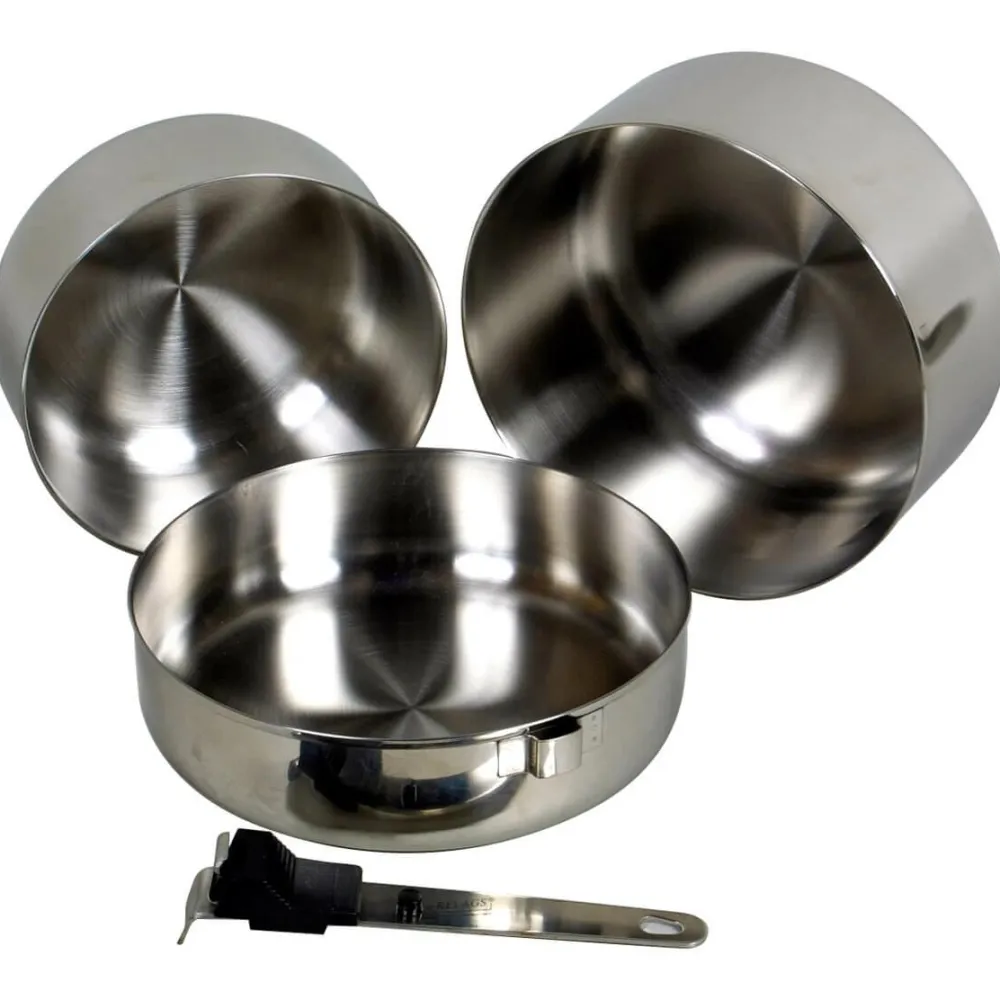 Damit das Kochen unterwegs Spaß macht: Das Biwak Edelstahl 1 Kochset von Basic Nature. Das Set für ein bis zwei Personen beinhaltet zwei Töpfe, eine Pfanne und einen Griff. Die Töpfe haben ein Volumen von 1,1 und 1,8 Liter. Die Pfanne hat einen Innenbodendurchmesser von 18 cm, am oberen Rand ist sie 19,5 cm breit. Selbstverständlich lassen sich alle Teile ineinander stapeln und nehmen so wenig Platz weg. Das Biwak Edelstahlset 1 ist damit ideal für Camping und auf Tour geeignet.