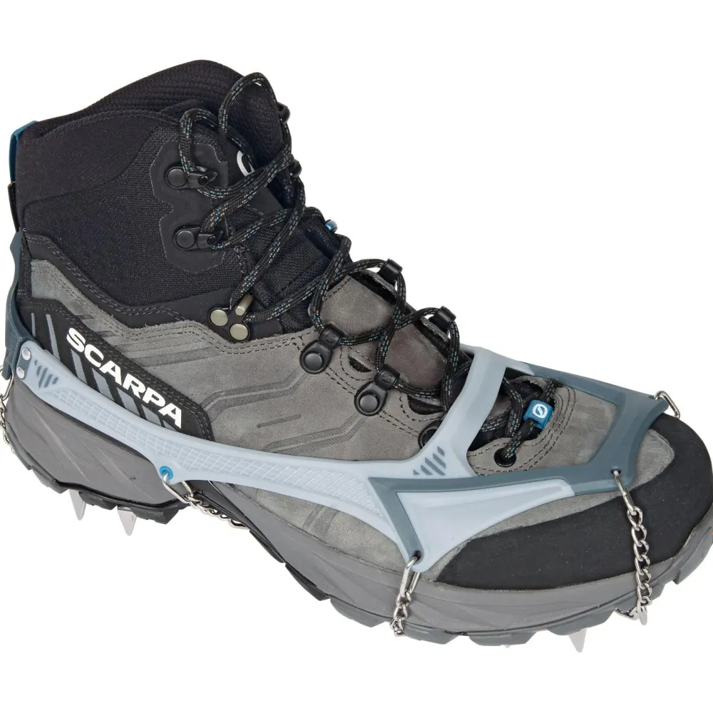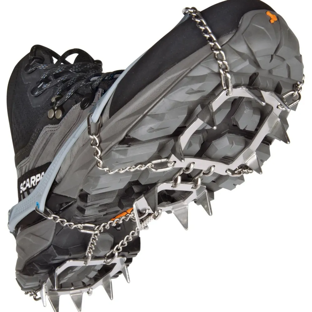 Die 16 Zacken sind so angeordnet, dass sie die Traktion, den seitlichen Halt und das Abbremsen auf Schnee, Eis, Schlamm, nassem Gras, Flechten oder überwachsenen Felsen optimieren. Perfekt abgerundet werden diese vielseitigen Helfer durch die mitgelieferte, leichte und kompakte Transportbox!