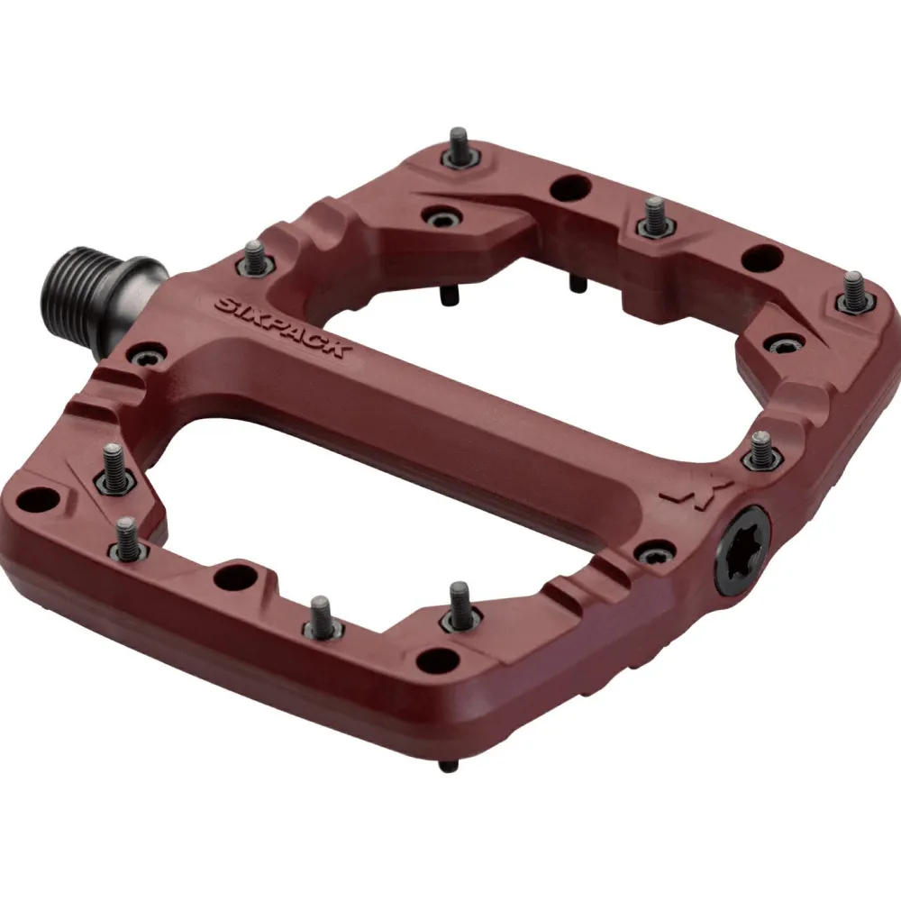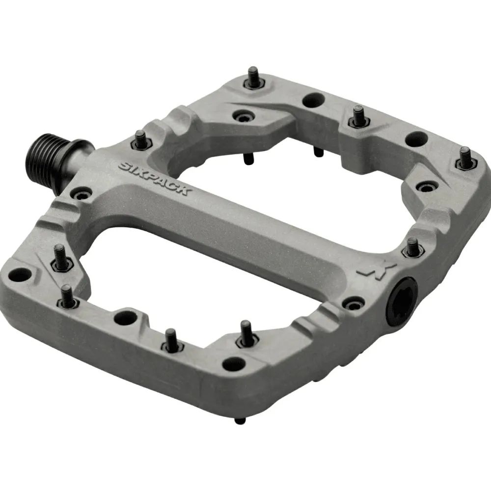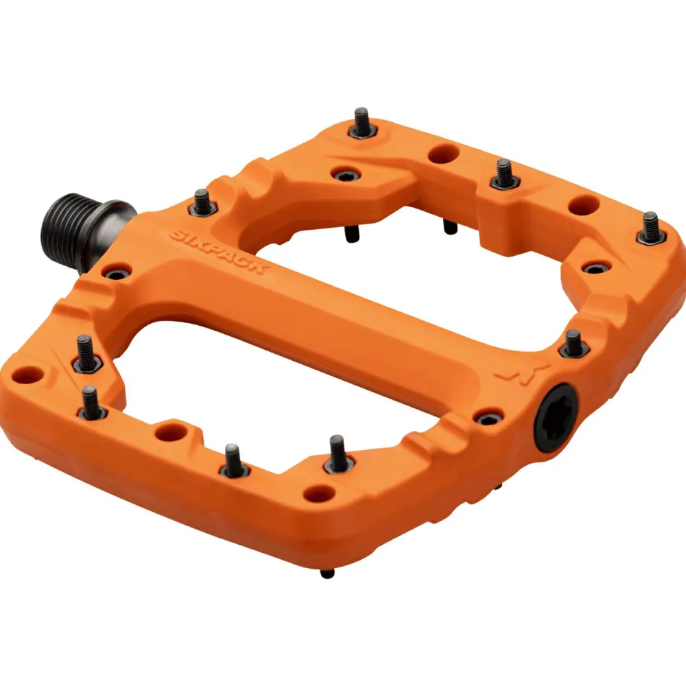 Das sind Sixpack Racing’s Kamikaze PA! Das Ziel bei der Entwicklung war, ein sehr robustes, gleichzeitig aber sehr leichtes Plattform-Pedal zu bauen. Das ist Sixpack Racing mit dem Kamikaze PA gelungen! Der Pedalkörper besteht aus glasfaserverstärktem Polyamid, sodass eine extreme Belastbarkeit bei geringem Gewicht gegeben ist. Die Standfläche ist 105 x 114mm groß, mit vorgeformtem Profil und gespickt mit 18 extra langen Stahlpins pro Seite, die für besten Halt auf dem Pedal sorgen.