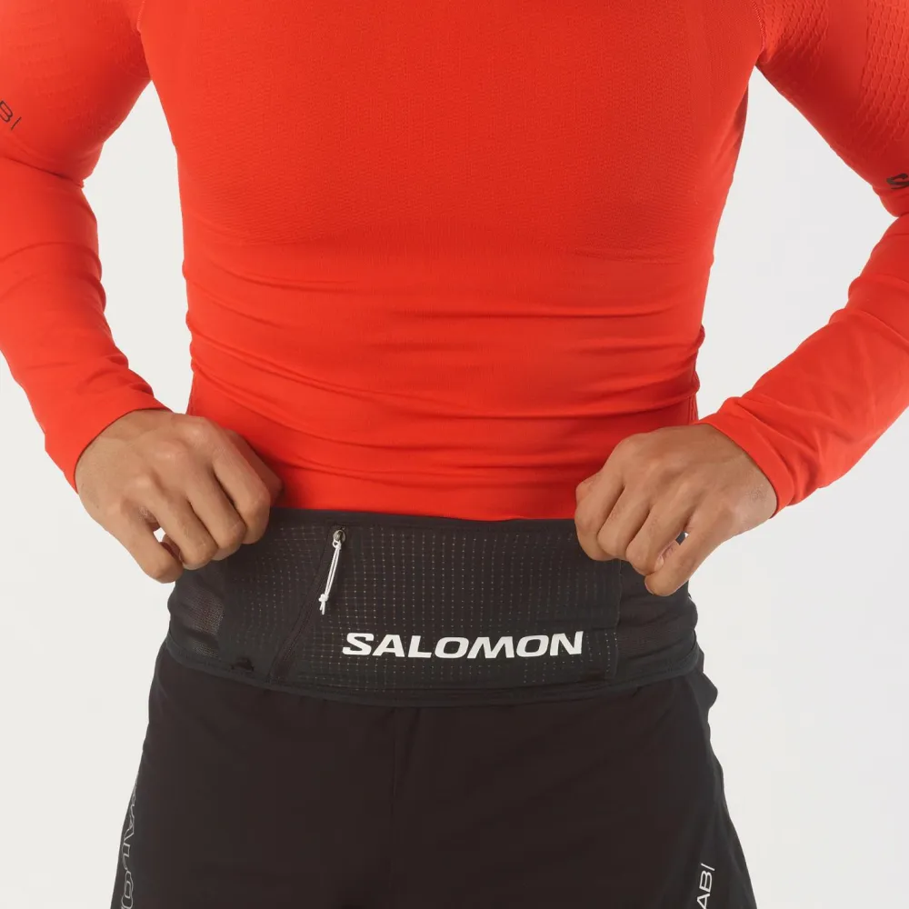 Der S/LAB Belt von Salomon ist ein körpernaher Trinkgürtel, der speziell für die Anforderungen beim Trailrunning entwickelt wurde. Er besteht aus ultraleichtem, atmungsaktivem und hochelastischem Material und sitzt daher sicher und bequem auf den Hüften. In den clever platzierten Taschen lassen sich Trinkflaschen und Basics griffbereit verstauen. Zwei seitliche Mesh-Taschen, eine Reißverschlusstasche und eine erweiterbare Mesh-Tasche bieten ausreichend Stauraum für alles, was du auf mittellangen Strecken benötigst.