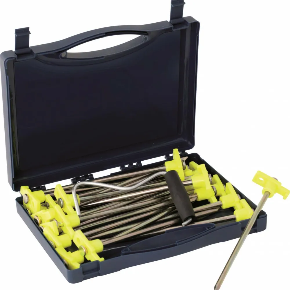 Praktisch ausgestattet bist Du mit den Zeltheringen Spike Peg Box von Outwell! Die Heringe aus Stahl sind langlebig und robust. Sie lassen sich mit einem Hammer schnell im Boden versenken. Mit dabei ist ein Haken, mit dem Du die Heringe unkompliziert wieder aus dem Boden holen kannst. In der Box wird alles aufbewahrt. Da die Heringe reflektierend sind, stolperst Du nicht bei Dunkelheit. Ein durchdachtes Set!