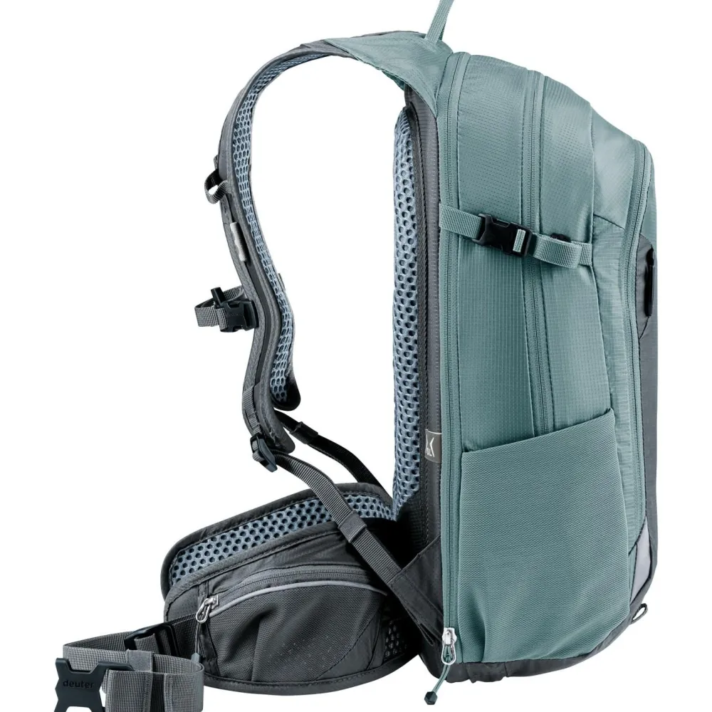Dank westenartigem Schulterträgeransatz, Brustgurt mit einhändig bedienbarer Schnalle und verstellbaren Netzhüftflossen bleibt der Compact 14 + 3 während der Fahrt optimal am Körper positioniert.