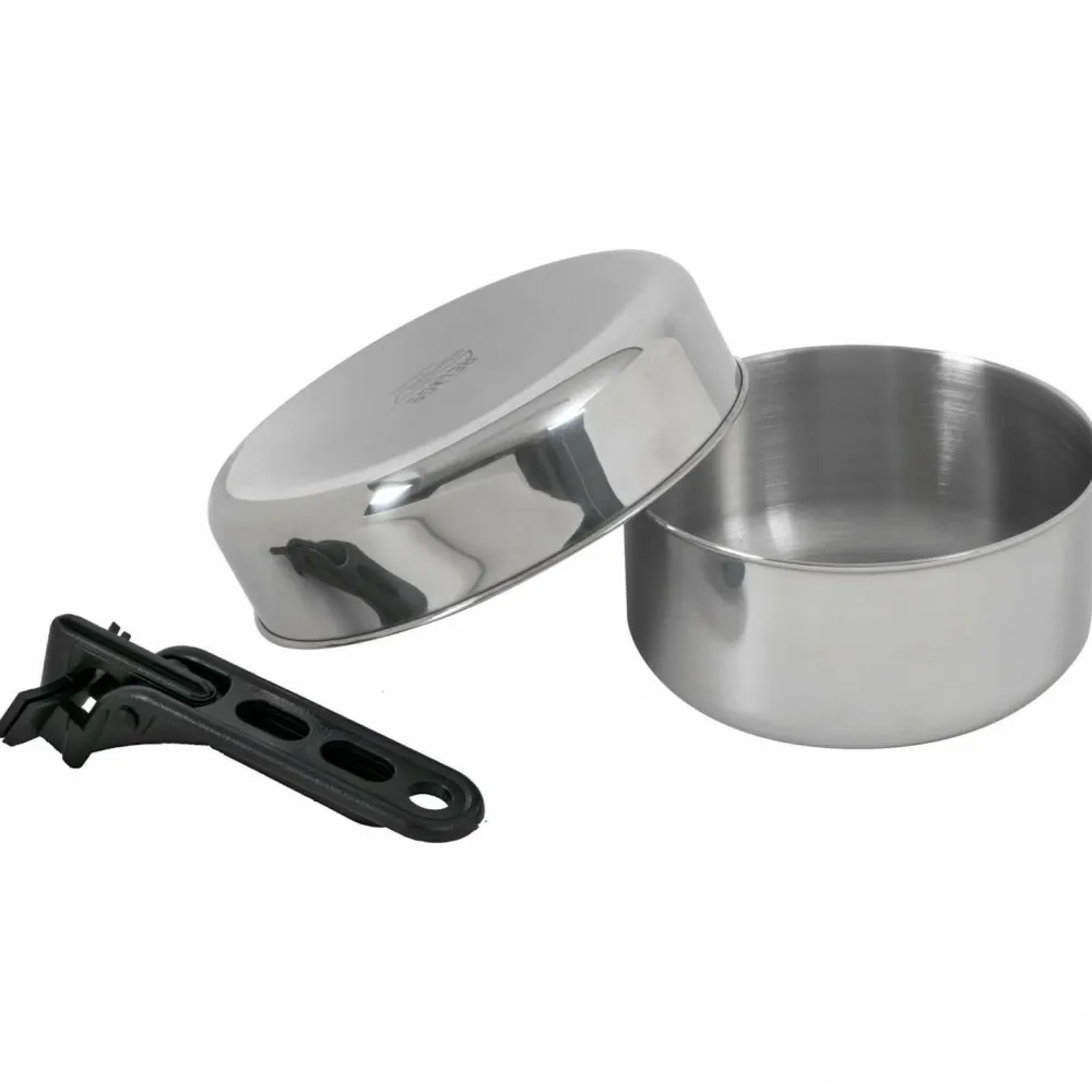 Robust, langlebig, einfach zu reinigen: das Biwak Edelstahl Junior Kochset ist perfekt auf den Outdoorgebrauch zugeschnitten! Ob beim Camping, nach einer anstrengenden Tour am Lagerfeuer oder im Urlaub, hiermit gelingt die schmackhafte Outdoormahlzeit garantiert. Das Set ist für eine Person geeignet, aus rostfreiem Edelstahl gefertigt und besteht aus einem Topf samt Deckelpfanne. Natürlich kann das Kochset auf allen handelsüblichen Kochern eingesetzt werden und durch die optimale Hitzeverteilung werden die Speisen gleichmäßig und schnell erwärmt. Ein praktischer Edelstahlgriff ist ebenfalls mit dabei, so sind die Hände vor Verbrennungen am heißen Topf geschützt. Da im Rucksack in aller Regel Platzmangel herrscht, lässt sich das Kochset platzsparend verpacken. Also los, den Biwak Edelstahl Junior eingepackt und los geht’s nach draußen!