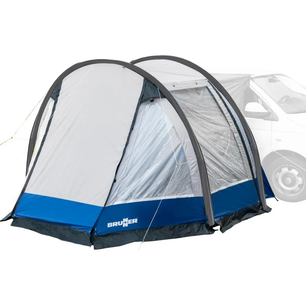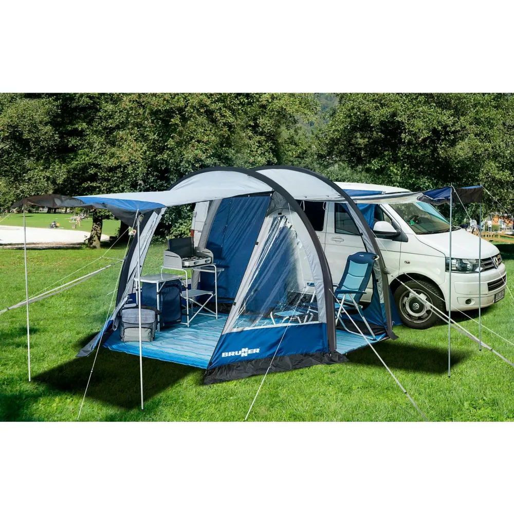 Das Zelt besitzt einen großen Fronteingang und zwei gegenüberliegende Seiteneingänge, die einen bequemen Zugang von allen Seiten ermöglichen. Mithilfe von separat erhältlichen Aufstellstangen können die Eingangstüren auch als praktisches Sonnendach verwendet werden, um ein schattiges Plätzchen im Freien zu schaffen. Die großen Klarsichtfenster an der Front bieten einen guten Blick nach draußen und sorgen gleichzeitig für eine helle und freundliche Raumatmosphäre. Darüber hinaus ist das Zelt mit mehreren Ventilationsöffnungen ausgestattet, um ein angenehmes Raumklima zu gewährleisten. Der mitgelieferte Packsack erleichtert den Transport und rundet das stimmige Gesamtpaket ab. Mit dem Entrada von Brunner steht dem nächsten Ausflug mit dem Campingbus nichts mehr im Weg!