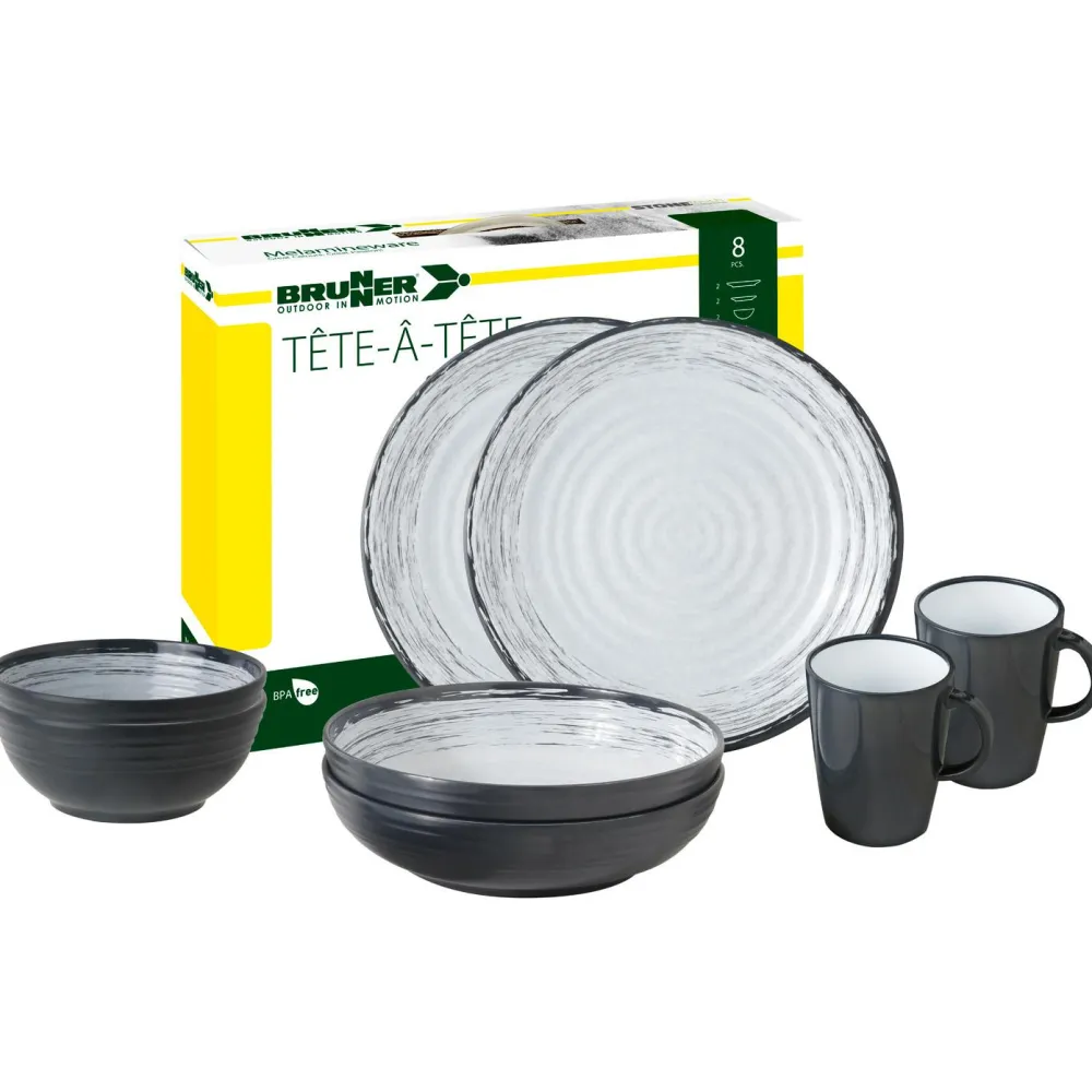 Für eine gelungene Mahlzeit auf dem Campingplatz: das Set Tête-À-Tête von Brunner! Das Geschirrset ist zu einhundert Prozent aus robustem Melamin gefertigt, das rutschfest und äußerst hitzebeständig ist. Das Set besteht aus zwei Esstellern, zwei Suppentellern, zwei Schüsseln sowie zwei Henkelbechern mit einer Füllmenge von 300 ml.