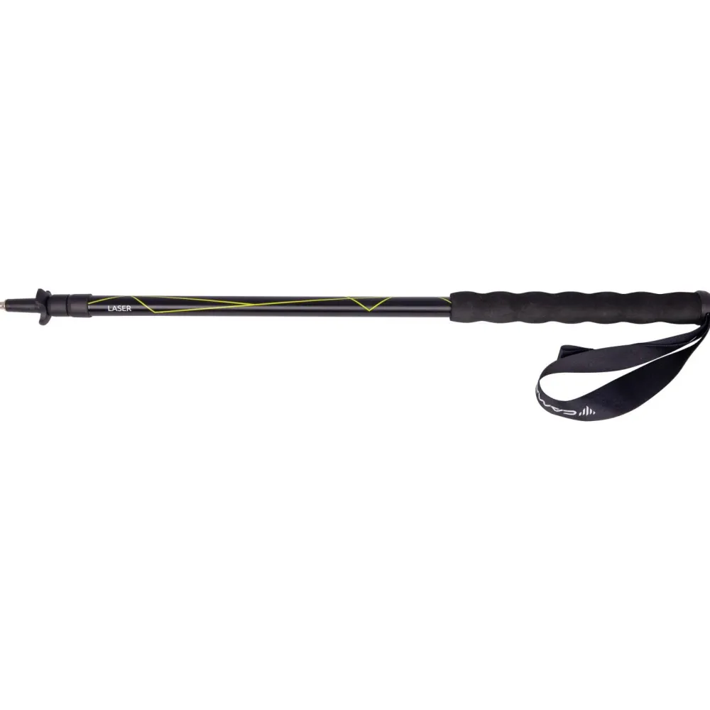 Der Laser-Teleskopstock von den italienischen Bergsport-Spezialisten von C.A.M.P. ist der Leichteste im Portfolio des Herstellers. Entsprechend eigent er sich für lange Treks und anspruchsvolle Wanderungen, bei denen kein Gramm zu viel dabei sein soll. Dieses Konzept zieht sich durch die gesamte Konstruktion des Laser: von den reduzierten Querschnitten der Aluminiumrohre über das Minimal-Design der Handschlaufe bis hin zum Teller mit lediglich 30mm Durchmesser. Das intern untergebrachte, Rotating Lock genannte und durch Drehen zu bedienende Verriegelungssystem trägt zur aufgeräumten Optik ebenfalls ganz entschieden bei. Für den bei allem Minimalismus notwendigen Komfort sorgt der Griff aus gut dämpfendem EVA, der außerdem extra lang am Schaft herabläuft, sodass Du zahlreiche Möglichkeiten hast, umzugreifen, beispielsweise in sehr steilem Gelände.