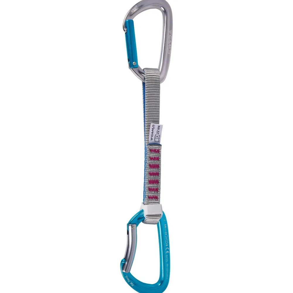 Mit 101g pro Stück gehört die Orbit Express KS von den italienischen Kletter- und Bergsport-Spezialisten C.A.M.P. zu den leichten Expressen. Die Karabiner sind dabei zwei Orbit– Exemplare, das sind sehr leichte Schnappkarabiner jeweils geradem (bei der Wandsicherung) und gebogenem Schnapper (zum Seilklippen). Die großzügige Öffnung von 25mm erleichtert das Einklippen dabei ebenso wie der gebogene Schnapper. Darüber hinaus ist der untere Orbit-Karabiner mit dem Karstop Evo ausgestattet, das ist ein innovativ konzipierter Karabinerhalter aus TPU, der im Band integriert ist, und das Verbleiben in einer korrekten Position sichert.