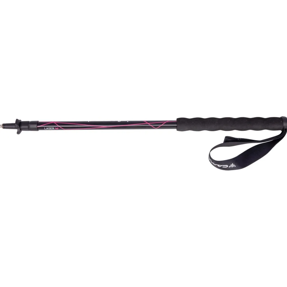 Der Women’s Laser-Teleskopstock von den italienischen Bergsport-Spezialisten von C.A.M.P. ist der Leichteste im Portfolio des Herstellers. Entsprechend eigent er sich für lange Treks und anspruchsvolle Wanderungen, bei denen kein Gramm zu viel dabei sein soll. Dieses Konzept zieht sich durch die gesamte Konstruktion des Women’s Laser: von den reduzierten Querschnitten der Aluminiumrohre über das Minimal-Design der Handschlaufe bis hin zum Teller mit lediglich 30mm Durchmesser. Das intern untergebrachte, Rotating Lock genannte und durch Drehen zu bedienende Verriegelungssystem trägt zur aufgeräumten Optik ebenfalls ganz entschieden bei. Für den bei allem Minimalismus notwendigen Komfort sorgt der Griff aus gut dämpfendem EVA, der außerdem extra lang am Schaft herabläuft, sodass Du zahlreiche Möglichkeiten hast, umzugreifen, beispielsweise in sehr steilem Gelände.