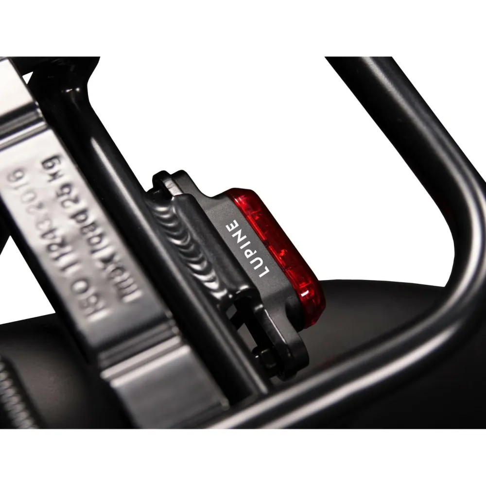 Das C14 G mit Bremslicht von Lupine dient als helles rotes Rücklicht am Gepäckträger. Es dient zur Montage an E-Bikes mit Gepäckträger und 50 mm Lochabstand und beinhaltet 14 COB-LEDs, die mit 80 Lumen für gut sichtbares rotes Licht sorgen. Die LEDs sind in ein wasserdichtes Gehäuse aus gefrästem Aluminium verbaut und beziehen ihren Strom direkt aus dem E-Bike Akku. Das System lässt sich an fast allen gängigen Akkus von Bosch, Brose oder Shimano anschließen. Außerdem ergänzt ein integriertes Bremslicht mit G-Sensor die rote Leuchte von Lupine.