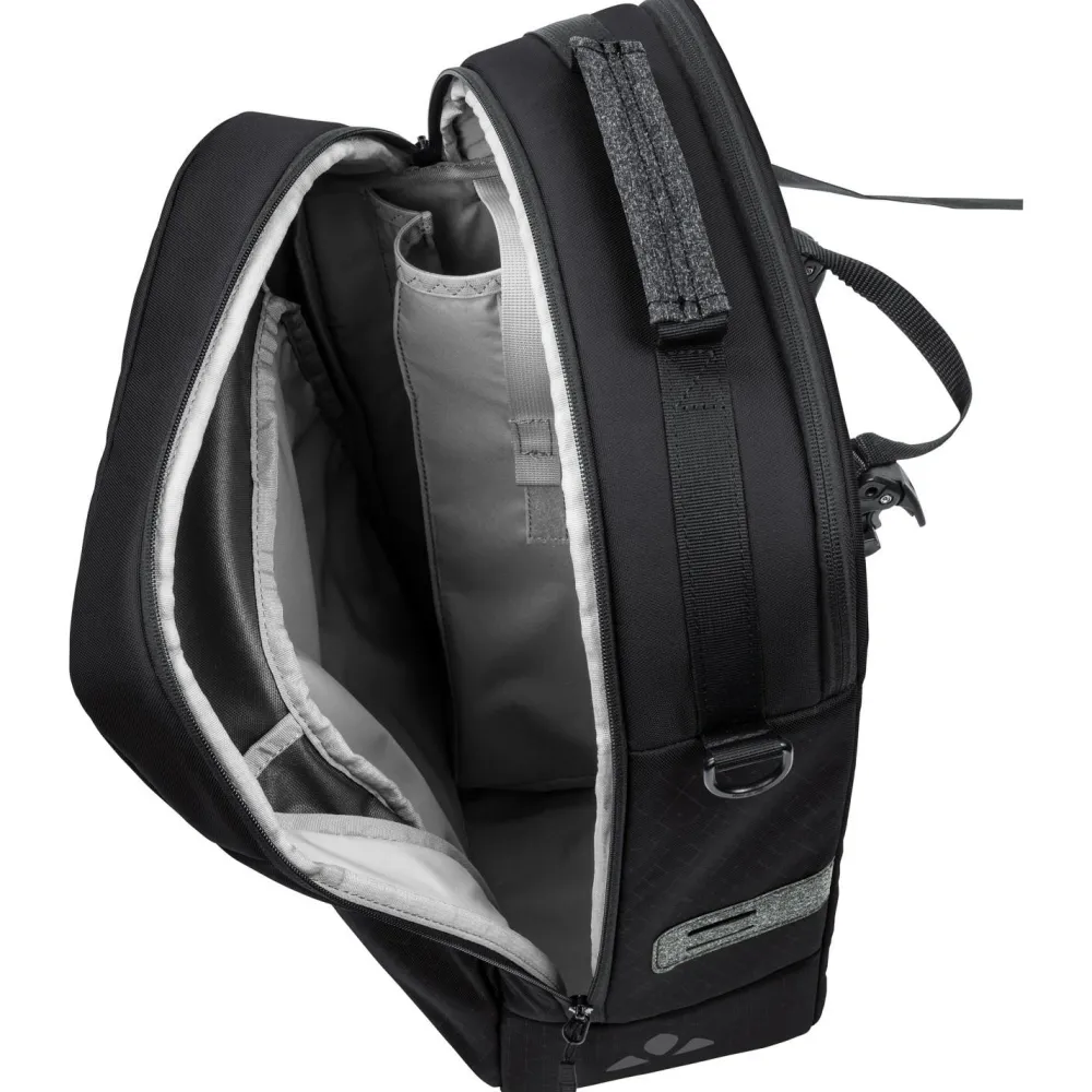 Die Eback Single Gepäckträgertasche von Vaude bietet in ihrem separaten Notebookfach Platz für ein 15,6“ großes Notebook. Im geräumigen Hauptfach lässt sich außerdem ein zweiter E-Bike Akku (bis zu 40 cm Länge) verstauen. Ein extra Außenfach mit Reißverschluss und interner Organizeraufteilung ergänzt das funktionelle Design. Die Tasche verfügt über Schulterträger und Tragegriff. Per QMR 2.0 Befestigungssystem wird die Fahrradtasche bequem am Gepäckträger eingehängt (Durchmesser 8-16 mm). Zudem ist das QMR abschließbar. Bei 22 Liter Volumen passt das mobile Büro bequem in die Packtasche.
