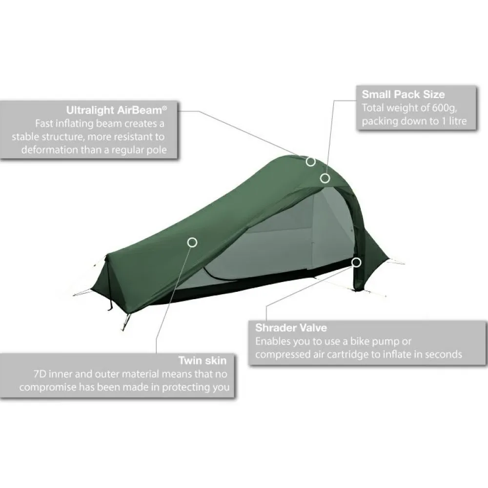 Ideal für Bikepacker geeignet – das F10 Hydrogen Air von Vango. Das ultraleichte Zelt wiegt gerade einmal 600 Gramm – leichter geht aus kaum. Zudem ist es zusammengepackt kaum größer als eine Wasserflasche. Dies sind die beiden Hauptargumente dieses Zeltes und prädestinieren es für Reisen, bei denen Gewicht und Packvolumen stark eingeschränkt sind. Ein weiterer Pluspunkt ist der simple Aufbau: lediglich am Fußende wird ein Gestänge genutzt, die Hauptlast übernimmt der aufblasbare Luftkanal. Dieser kann mit einer Fahrradpumpe aufgeblasen werden und sorgt bei starkem Wind für einen stabilen Stand. Das TBS II Tension Band System erhöht die Windstabilität zusätzlich.