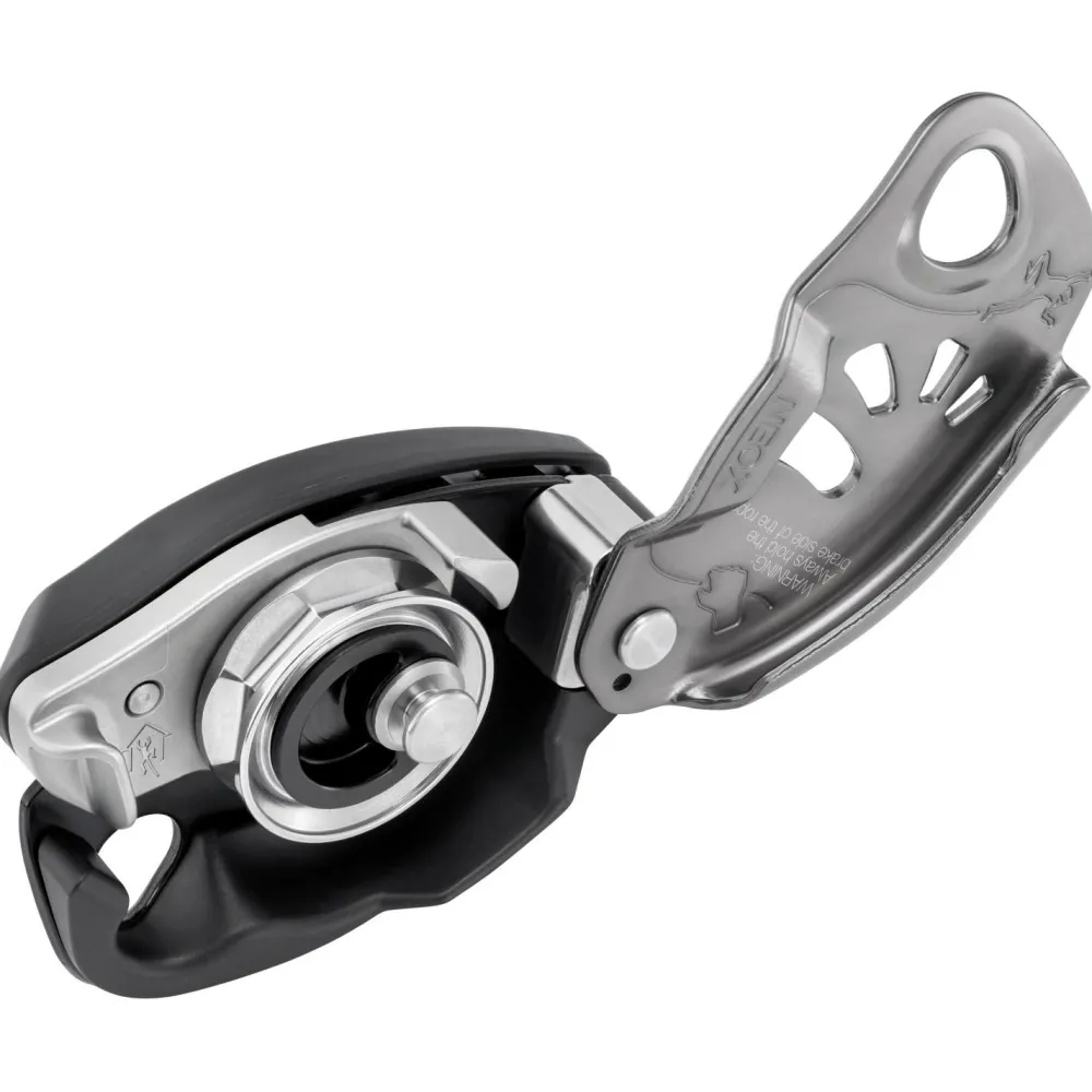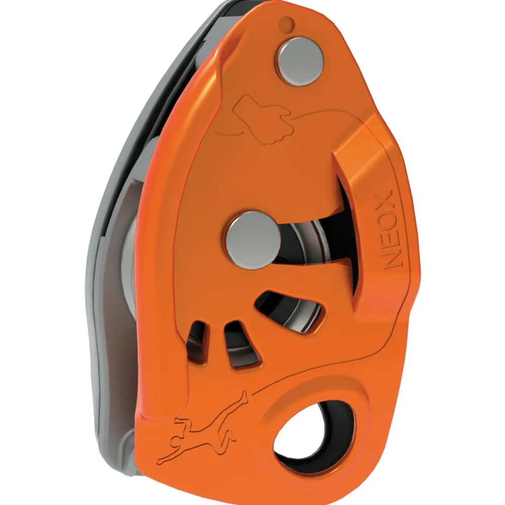 Das integriertes Rad im Neox sorgt für einen gleichmäßigen Seildurchlauf und ermöglicht so ein schnelles Seilausgeben. Der ergonomische Hebel bietet eine komfortable Steuerung der Abseilfahrt und bietet dabei eine dreimal höhere Kraftübertragung für eine noch bessere Kontrolle bei geringen Seildurchmessern und weniger Kraftaufwand für die Betätigung des Hebels bei großen Seildurchmessern. Bei einem Sturz oder einer Rast des Kletternden spannt sich das Seil und das Rad blockiert. Dann dreht sich der Klemmnocken und greift in das Seil, um es zu blockieren.