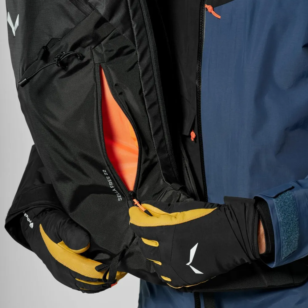 Der Sella Free 22 Skitourenrucksack ist schmal geschnitten und trägt sich sportlich und körpernah. Er bietet 22 Liter Stauraum und kann Ski mit einer Breite bis 12 cm bequem transportieren. Außerdem verfügt der Salewa Rucksack über ein extra Fach für die LVS-Ausrüstung, sowie Helmhalterung, extra Frontfach und Innenfach für Wertsachen und kleine Accessoires. Auch eine Halterung für Eispickel oder Skistock ist in den funktionellen Rucksack integriert.