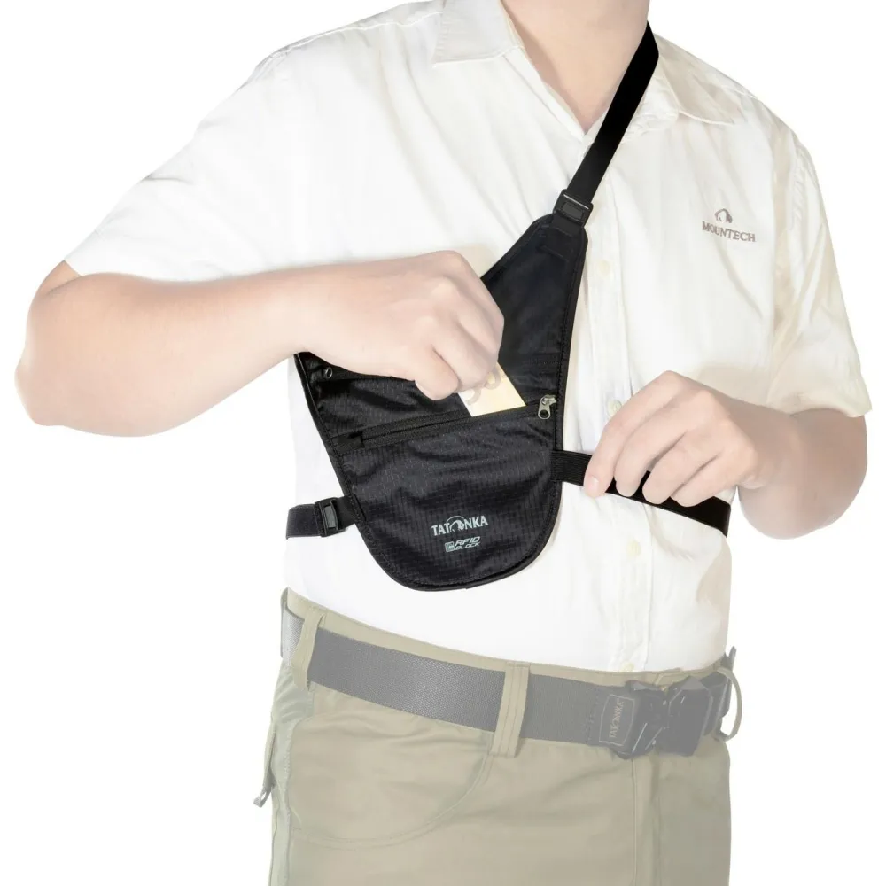 Das Skin Chest Holster RFID B von Tatonka bietet Dir eine sichere Möglichkeit, Deine Wertsachen am Körper zu tragen. Mit zwei Reißverschlusstaschen und der eingearbeiteten, TÜV-zertifizierten CRYPTALLOY®-Folie schützt es Deine sensiblen Daten vor RFID-Auslesegeräten. Die Geldkatze wird wie ein Pistolenholster getragen, wodurch Geld, Kreditkarten und Reisepässe für Taschendiebe nahezu unsichtbar und schwer erreichbar verstaut und außerdem vor Datenklau sicher sind.Die Folie schützt sensible Daten auf Reisepässen, Personalausweisen, Hotel-Schlüsselkarten sowie Bank- und Kreditkarten. Das Skin Chest Holster RFID B wird mit zwei Gurten befestigt und bietet Dir somit sicheren Halt und Tragekomfort.