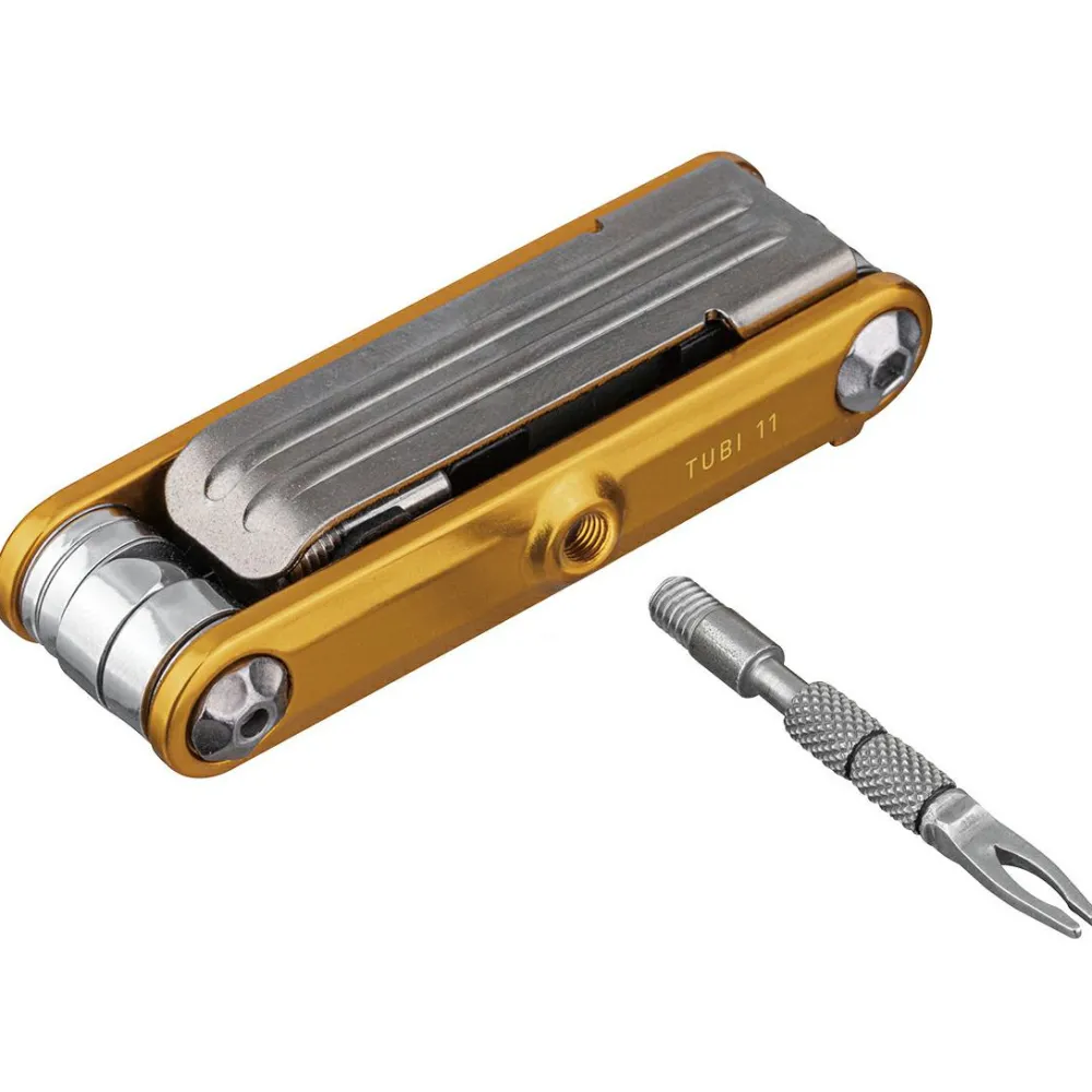 Mit dem Tubi 11 Combo Fahrradwerkzeug von Topeak lassen sich Tubeless-Reifen unterwegs bequem reparieren. Die Tubeless-Tools lassen sich für optimales Handling während der Reparatur in den Werkzeugkörper schrauben.
