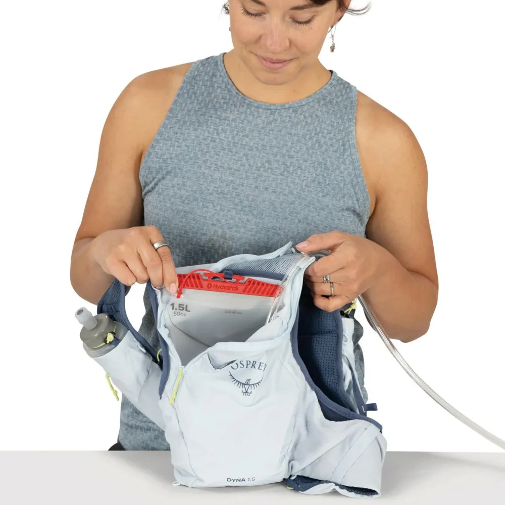 Ein bisschen Weste, ein wenig Rucksack, das ist der Women’s Dyna 1.5 von Osprey. Dieser Trailrunningrucksack begleitet Dich bei Deinen Trainingseinheiten und bietet dabei ausreichend Platz für alles, was unterwegs schnell zur Hand sein soll. Der Rucksack hat die Form einer Weste und sitzt somit gut, ohne dabei störend zu wirken.