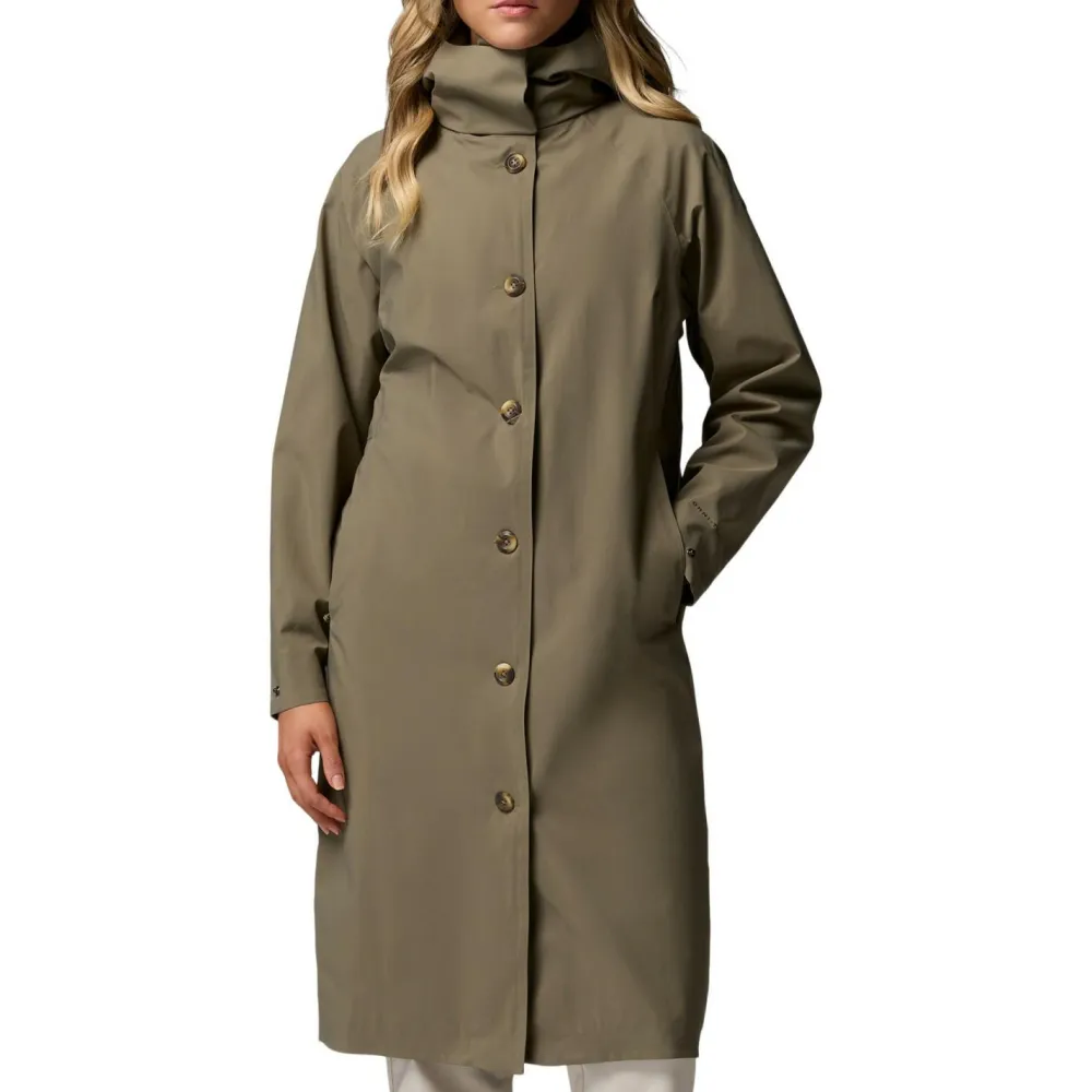 Die Women’s Amazetrench Rain Jacket von Columbia bietet verlässlich wasserdichte Materialien, die verhindern, dass es im Inneren des Mantels unangenehm nass wird. Zudem kann Feuchtigkeit, die beim Schwitzen entsteht, schnell nach draußen gelangen. Darum kümmern sich die atmungsaktiven Eigenschaften der Jacke. Wenn es stürmt und regnet, kann der Kopfbereich mit einer Kapuze vor dem Wetter geschützt werden. Damit sie perfekt sitzt, ist ein Kordelzug integriert, der die Feinjustierung ermöglicht.