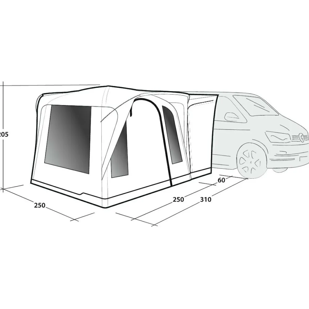 Mit seinen großzügigen Maßen von etwa 250 cm Länge, 225 cm Breite und 205 cm Höhe bietet das Daytona Air Busvorzelt reichlich Platz für Aktivitäten und Entspannung. Trotz seiner Größe ist es mit einem Gewicht von rund 15 kg relativ leicht, was den Transport erleichtert. Diese gelungene Kombination aus Raumangebot und Tragbarkeit macht das Zelt zu einer ausgezeichneten Wahl für Campingausflüge, bei denen sowohl Komfort als auch Mobilität gefragt sind.