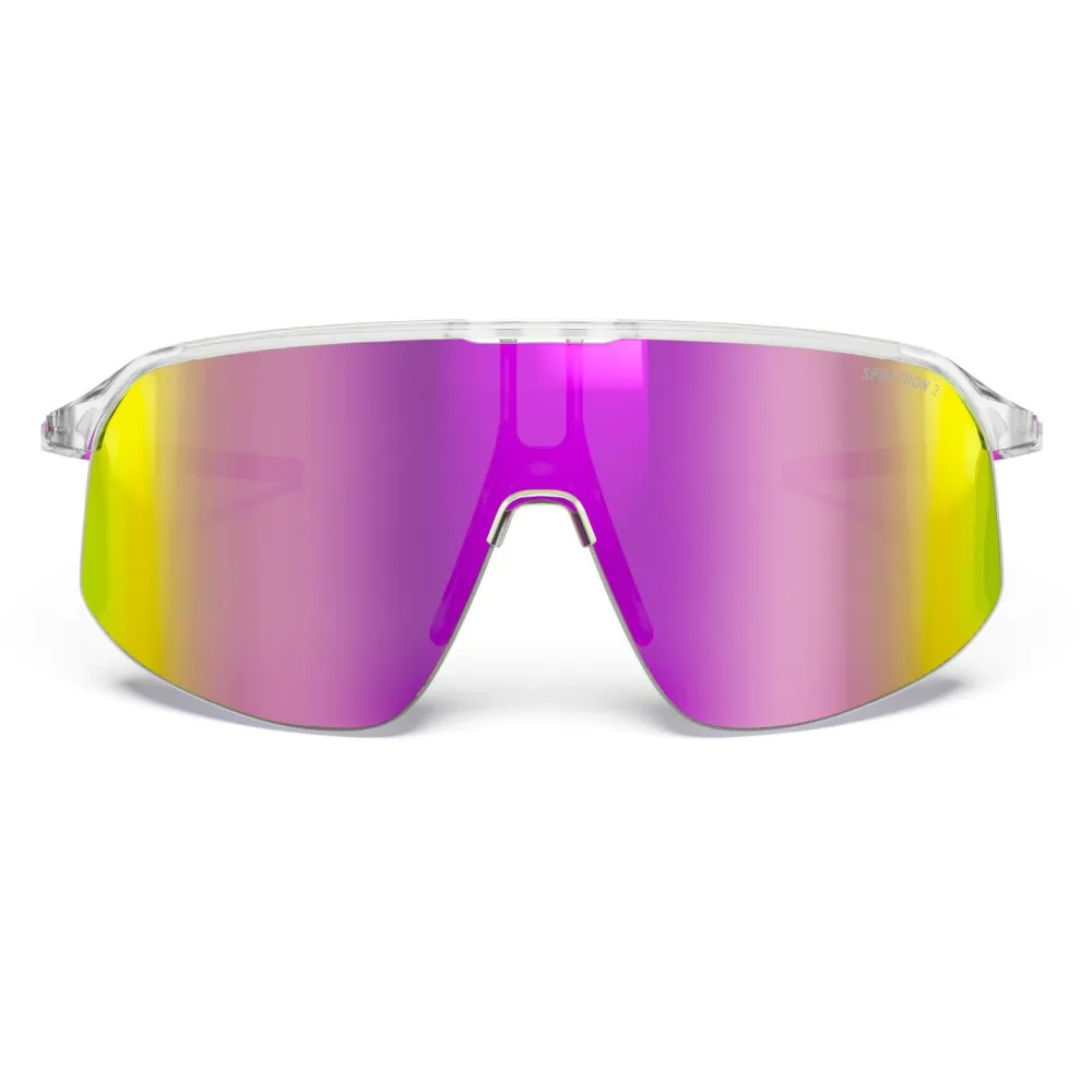 Sportlich, lässig und funktionell, das ist die Density Spectron S3 (VLT12%) von Julbo. Diese Fahrradbrille mit großer Scheibe begleitet Dich beispielsweise beim Radfahren oder Running. Durch den filigranen Halbrandrahmen ist sie dabei gut belüftet und sitzt angenehm. Gummierungen am Nasensteg und den Bügeln verhindern, dass die Brille rutscht. Die zylindrische Scheibe entspricht dabei der Schutzklasse 3 und hält durch die Verspiegelung auch grelles Licht zuverlässig ab.