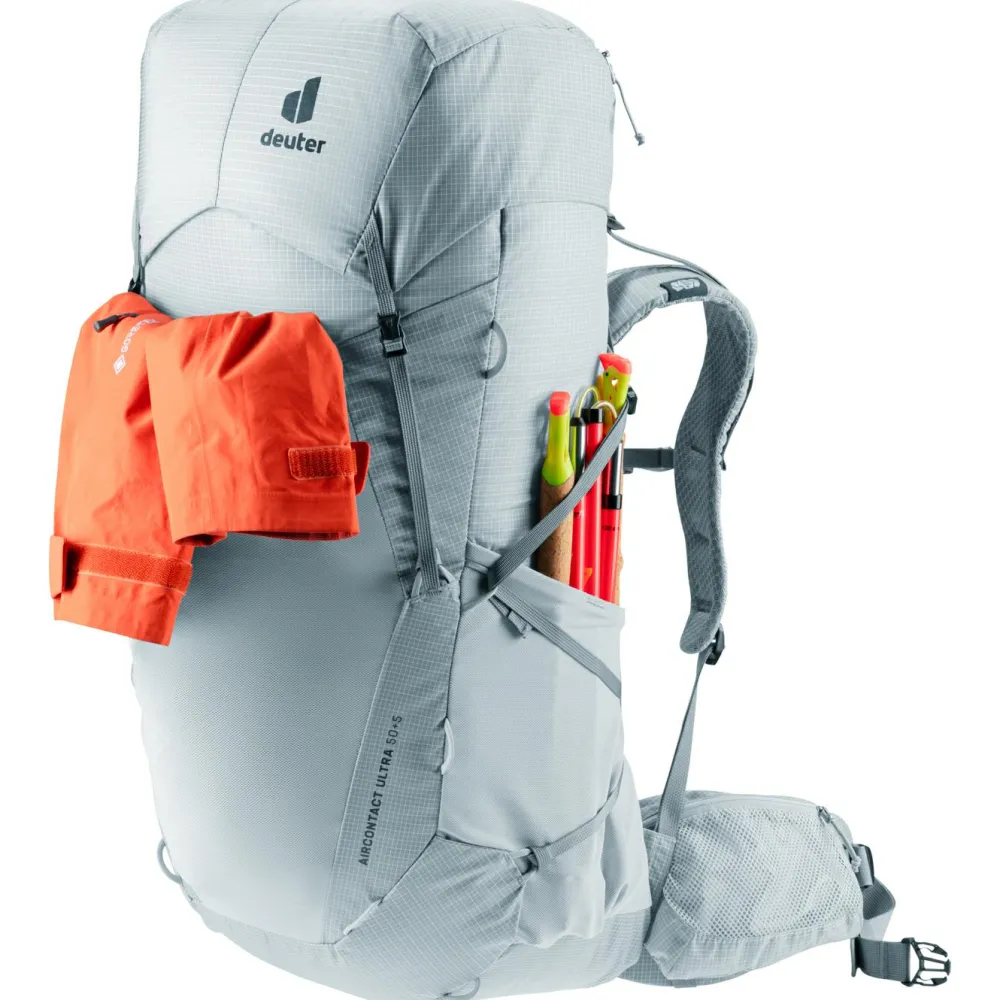 Du suchst einen robusten und bequemen Mehrtages-Trekking-Rucksack? Dann bist du mit dem Aircontact Ultra 50+5 gut beraten.Das Hauptmaterial besteht aus RIPSTOP-Polyamid und ist besonders reißfest.deuter legt Wert auf eine umweltfreundliche, ressourcenschonende Herstellung. Somit erfüllt der Aircontact Ultra 50+5 die Anforderungen des Grünen Knopfs und des bluesign products.Sowohl die ergonomisch geformten und gepolsterten Hüftgurte und Schulterträger, als auch der abnehmbare Brustgurt sind individuell einstellbar und das Gewicht des Rucksacks wird gut verteilt. Durch das Aircontact-Rückensystem von deuter mit dem Air Spacer Mesh wird Dein Rücken auch auf schweißtreibenden Passagen gut belüftet. So fühlt sich selbst schweres Gepäck leicht an.Der Aircontact Ultra 50+5 ist kompatibel mit Trinksystemen bis zu 3l, sodass Du Deinen Rucksack zum Trinken nicht absetzen musst.Durch die schlanke Form und sein minimalistisches Erscheinen macht der Aircontact Ultra 50+5 auch in anspruchsvollerem Gelände eine gute Form.