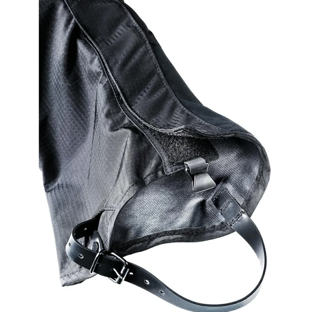 Die Gaiter von Deuter sind leichte Gamaschen, die Schlamm, Schmutz und Nässe vom Schuh fernhalten. Ihr leichtes und zugleich robustes Gewebe ist wasserabweisend, schnell trocknend und auf den Innenseiten gegen Abrieb verstärkt. Das An- und Ausziehen geht dank des Klettverschlusses über die gesamte Länge schnell vonstatten. Ein Kordelzug sorgt für die Anpassung an den individuellen Wadenumfang. Mit dem Druckkopf oben, dem Einhänge-Haken unten und dem robusten, verstellbaren Band unter dem Fuß wird der sichere Sitz der Gamaschen perfektioniert!