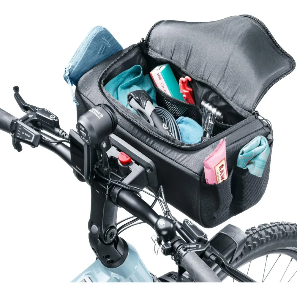 Die Handle Bar Bag 8 KF von Deuter ist eine praktische, robuste und für für KLICKfix-Lenker-Adapter geeignete Lenkertasche. Ihre Frontöffnung mit U-förmigem Reißverschluss erlaubt leichten Zugriff, während der elastische Kompressionszug, die beiden Seitentaschen und das Netz-Innenfasch zusätzliche Kleinigkeiten sicher unterbringen und fixieren. Dadurch hat man alle unterwegs benötigten Utensilien unterwegs immer sofort griffbereit!