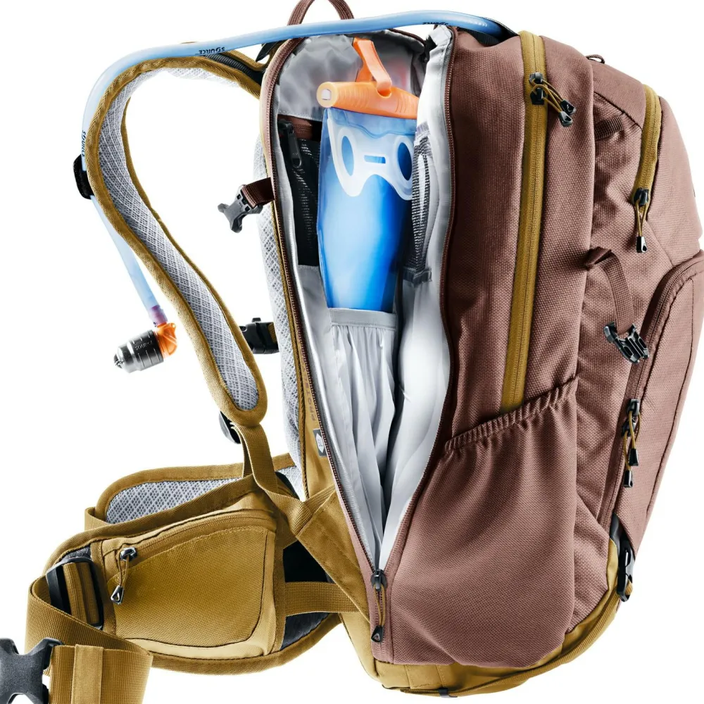 Ruppige Trails und anspruchsvolle Bike-Abenteuer sind das Zuhause des Women’s Attack 18 SL Bike-Rucksacks von deuter. Die vielen Taschen und Fächer ermöglichen ein sicheres und geordnetes Aufbewahren von Kleinigkeiten. Im vorderen Organizer-Fach lassen sich Kleinigkeiten genau am vorgesehenen Platz transportieren und sind mit einem Griff erreichbar. Um das Bike bei schwierigen Bergauf-Passagen leichter tragen zu können, lässt sich der Rahmen des Fahrrads auf dem verstärkten und rutschfesten Bereich am oberen Rücken des Attack auflegen. So müssen die Arme weniger Gewicht stemmen und die Passage kann mühelos überwunden werden. Im Falle eines Sturzes ist der Attack mit einem robusten Protektor für den Rücken ausgestattet. Das Material gelangt nach einer Verformung schnell wieder in den Ursprungszustand zurück. Um bei schweißtreibenden Bedingungen nicht zum Trinken anhalten zu müssen, ist der Rucksack mit einem Trinksystem kompatibel. Der Schlauch lässt sich durch ein vorgefertigtes Loch über die Schulterträger nach vorne führen.