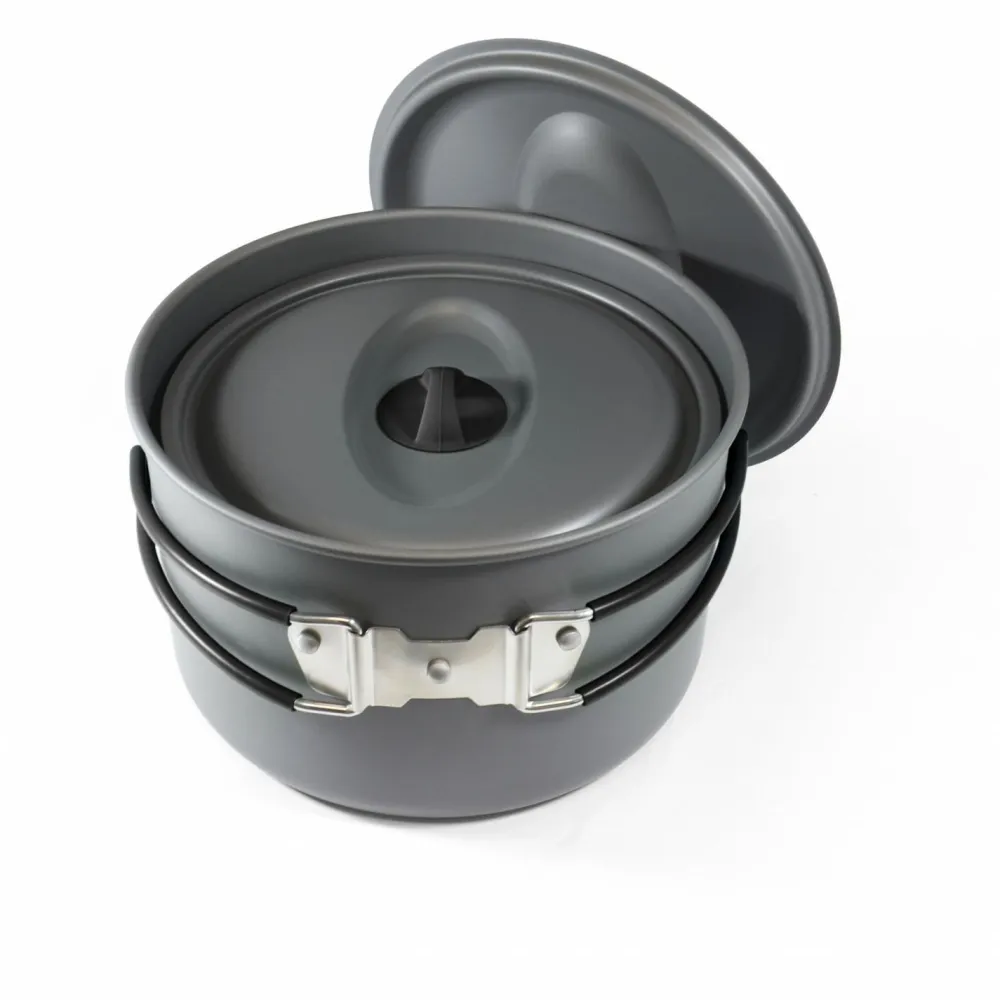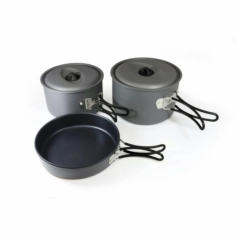 Das Biwak Topfset Family von Origin Outdoors ist ein sehr leichtes und kompaktes Set zum Campen! Darin enthalten sind zwei Töpfe und eine Pfanne. Die gummierten Klappgriffe bieten sicheren Halt beim Kochen. Platzsparend wird alles gestapelt im Netzbeutel verstaut.