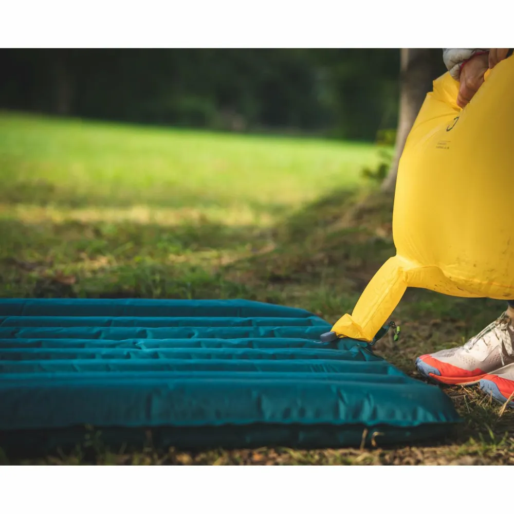 Die vertikalen Kammern sorgen für ein angenehmes Liegegefühl und sind mit einer leichten, bluesign zertifizierten Mikrofaser Isolation wattiert. Das schließt besonders viel isolierende Luft ein und dämpft effektiv die Kälte, die vom Boden ausstrahlt ab. Befüllt wird die Matte durch ein leicht bedienbares Flachventil. Die mitgelieferte Schnozzel Pumpag erlaubt Euch zudem ein schnelles Aufpumpen ganz ohne den Einsatz von Lungenkraft, was zudem der Bildung von Feuchtigkeit im Matteninneren vorbeugt. Zum Transport oder zu Lagerung lässt sich die Dura 5R zudem auf ein kompaktes Packmaß reduzieren. Klasse!