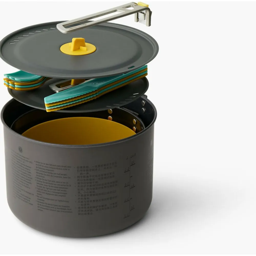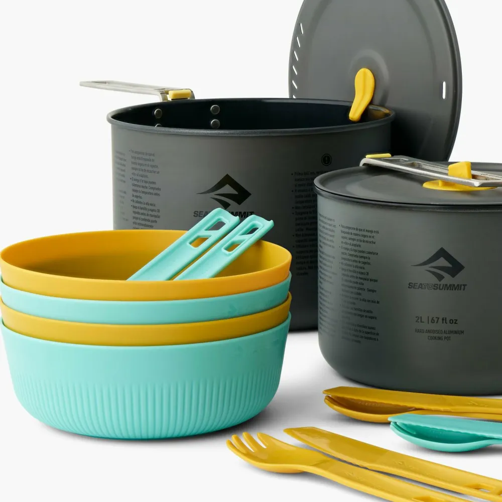 Das Sea to Summit Frontier UL Two Pot Cook Set (14 Pieces) besteht aus zwei Töpfen (Frontier Pots mit 2 Liter und 3 Liter Volumen), die zusammen mit ergonomischen Campingschalen und Besteck aus der Passage Serie die Basis für das beste Leichtgewichts-Set-Up unter den Campingküchen bilden.