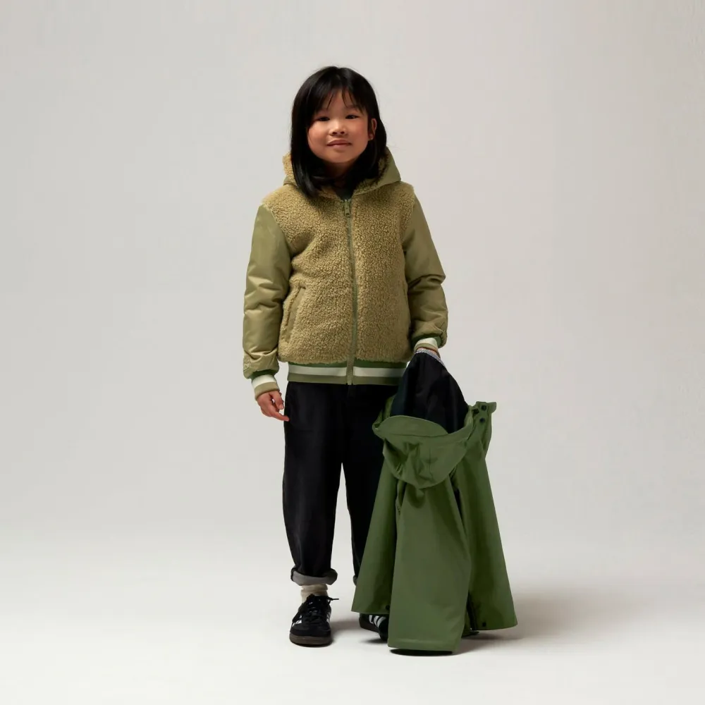 Die Außenjacke ist mit einer Kapuze samt kleinem Schirm ausgestattet, der das Gesicht bei Regen zusätzlich schützt. Verstellbare Ärmelbündchen sorgen dafür, dass kein Wind eindringt und die Jacke mitwächst. Die Innenjacke punktet mit elastischen Bündchen und einem weichen Fleece-Material, das zuverlässig wärmt. Beide Jacken lassen sich dank durchgehendem Reißverschluss einfach an- und ausziehen – ideal für Kinder, die viel draußen unterwegs sind.