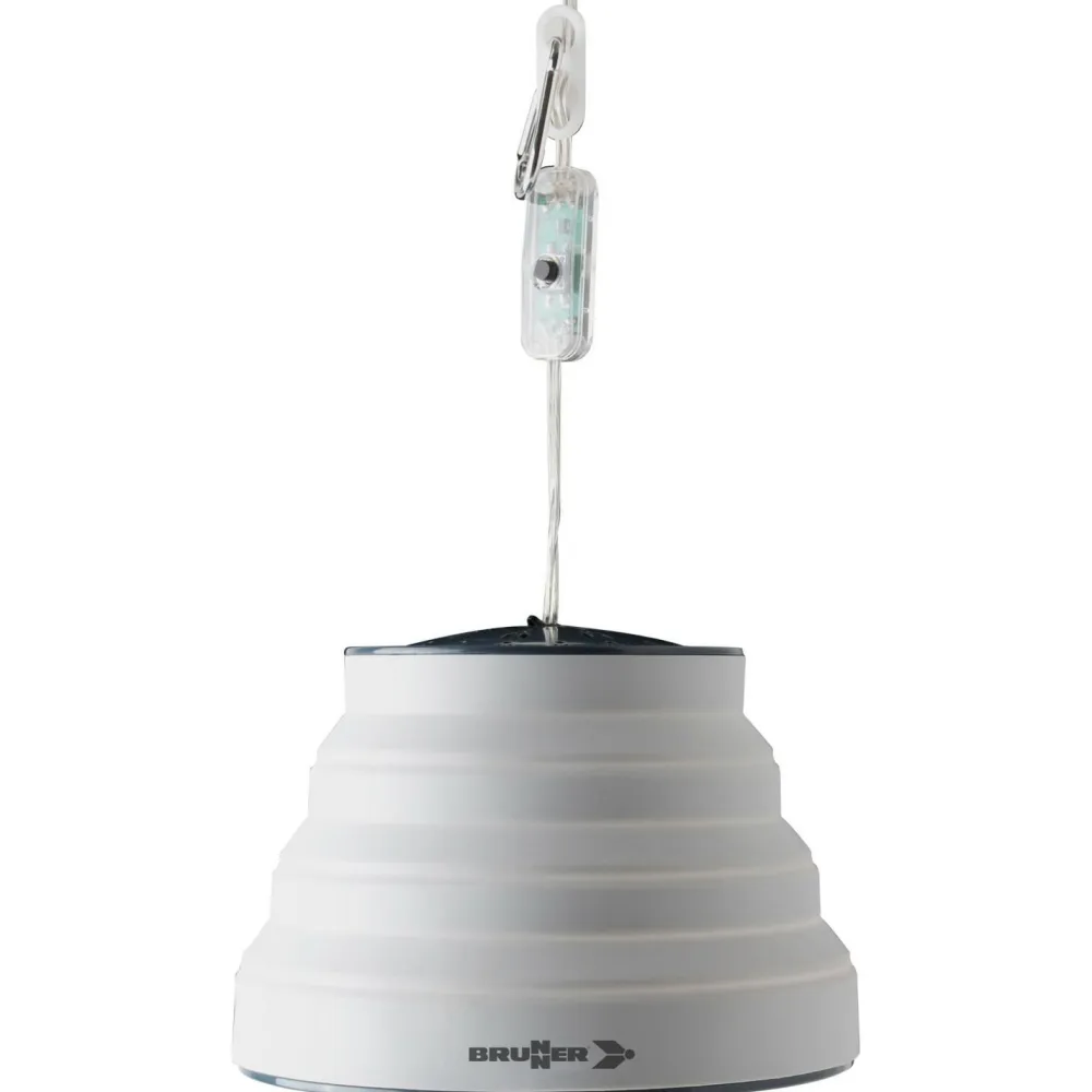 Der Lampenschirm der Syrma Fold-Away LED LED-Lampe von Brunner ist aus Silikon gefertigt und faltbar. So kann er von 12 cm Höhe auf platzsparende 4 cm Höhe komprimiert werden. Ob Vorzelt, Wohnmobil, Campervan oder Gartenlaube – die faltbare Hängelampe sorgt für ein angenehmes Licht.