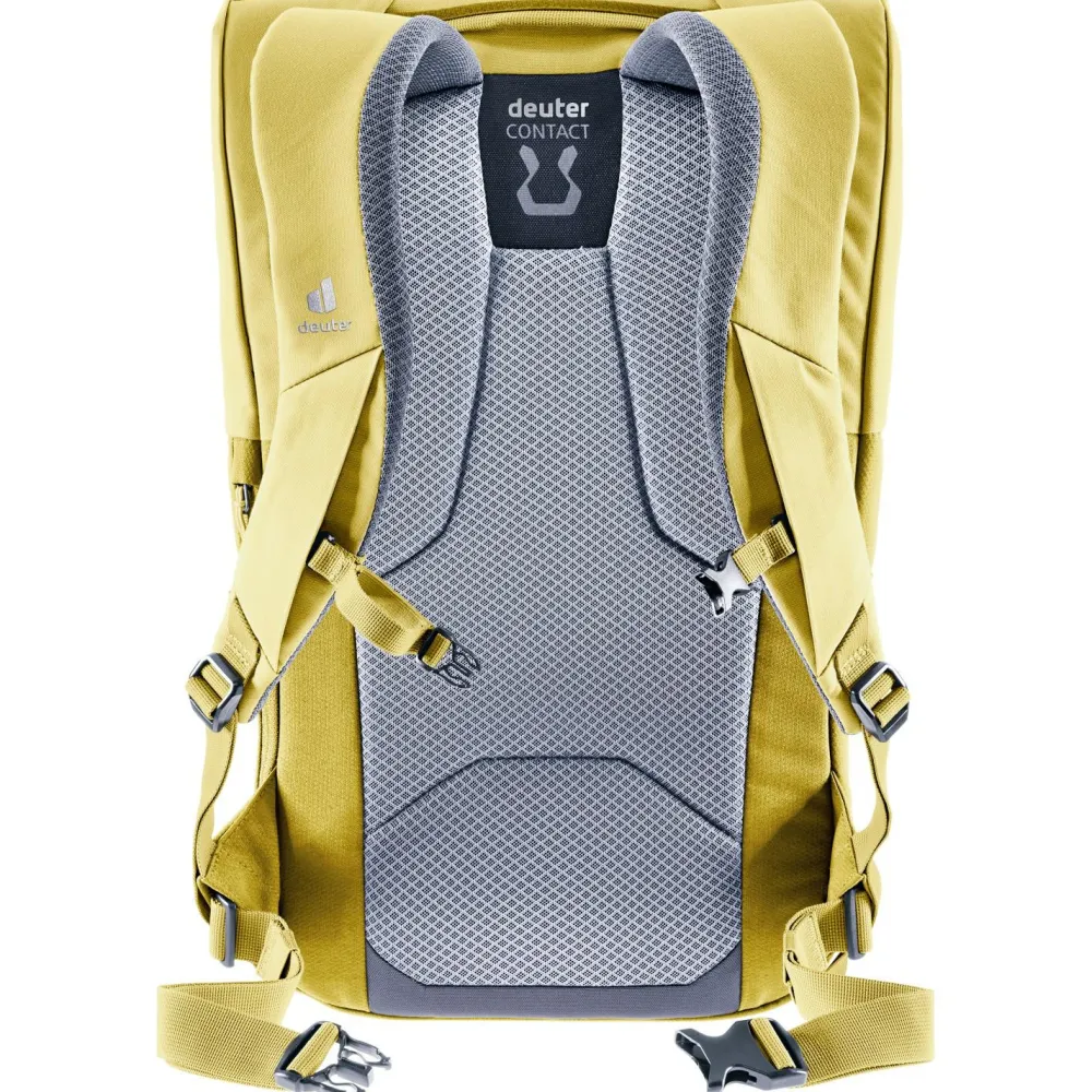 Der UP Seoul 16+10 von deuter ist ideal für Sportler mit urbanem Lifestyle, die sich einen nachhaltig produzierten Rucksack mit einer guten Übersicht für ihre Sachen wünschen. Der sportive Daypack ist komplett aus recycelten PET-Flaschen nach bluesign-Standard hergestellt.Dank seines bewährten deuter Aircontact-Rückensystems ist der Rucksack top belüftet. Gepolsterte, ergonomische Schultergräger, ein abnehmbarer Brust- und Bauchgurt ermöglichen individuelle Tragemöglichkeiten. Elektronische Gadgets wie Smartphone, Notebook und Laptop finden in drei unterschiedlich großen, eigens dafür konzipierten Innentaschen einen sicheren Platz. Ein großes Reißverschluss-Frontfach, zwei Seitentaschen mit und ohne Reißverschluss sowie ein Wertsachenfach innen bieten ausreichend Möglichkeiten, den Inhalt gut organisiert zu verstauen. Ein gepolsterter, stabiler Boden macht den UP Seoul 16+10 von deuter standfest. Komfortables Packen ermöglichen der umlaufende Zwei-Wege-Reißverschluss und ein zusätzlicher Frontgriff.