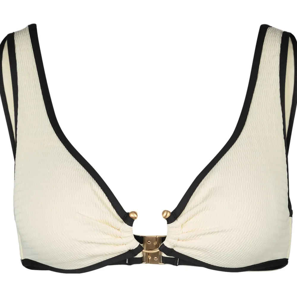Das Bikinioberteil besteht aus recyceltem Polyamid und Elasthan, was nicht nur für eine nachhaltige Wahl steht, sondern auch für eine flexible Passform und Strapazierfähigkeit sorgt.