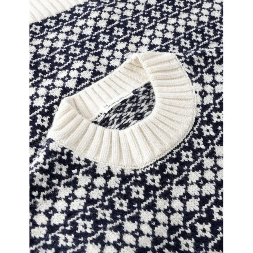 Mit seinem klassischen Muster und dem weichen Griff bringt dieser Pullover sofort Wohlfühlstimmung in deinen Alltag. Der Women’s Fair Isle Crew Neck kombiniert traditionelle Strickoptik mit modernen, stretchigen Materialien – perfekt für entspannte Wintertage. Der Rundhalsausschnitt und die feinen Strickbündchen sorgen für eine bequeme Passform und einen zeitlosen Look. KnowledgeCotton Apparel steht für hochwertige Mode mit Charakter – verwurzelt im skandinavischen Design und gefertigt mit Rücksicht auf Mensch und Natur.