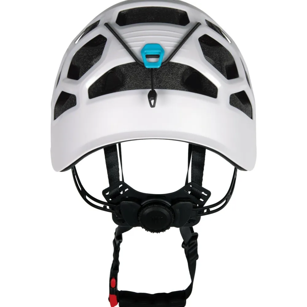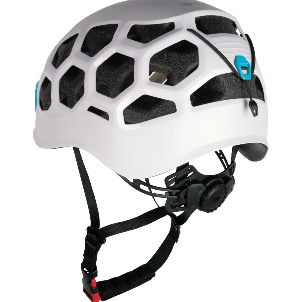 Das Verstellsystem ist mit einem praktischen Drehrad ausgestattet, das auch mit einer Hand bedient werden kann. Es lässt sich zudem so kippen, dass es in den im Rucksack verstauten Helm passt. Bei der Damenversion wurde zwischen Drehrad und der Schale zusätzlich Platz gelassen, damit der Pferdeschwanz bequem Platz findet. Eine Stirnlampenhalterung kann mit den beiden vorderen Clips und einem hinteren Gummiband funktionell, praktisch und schnell verwendet werden.