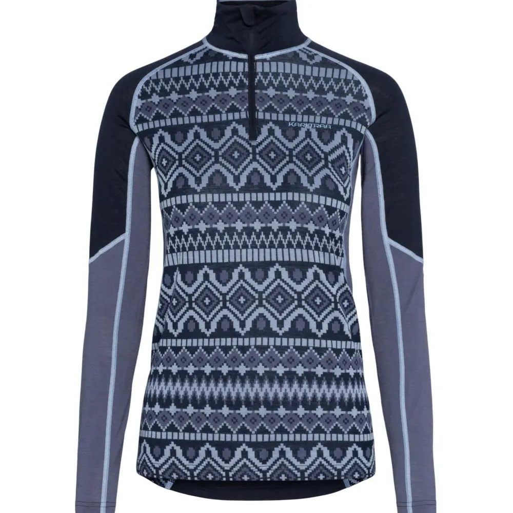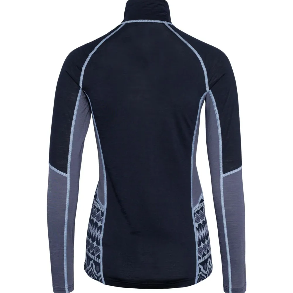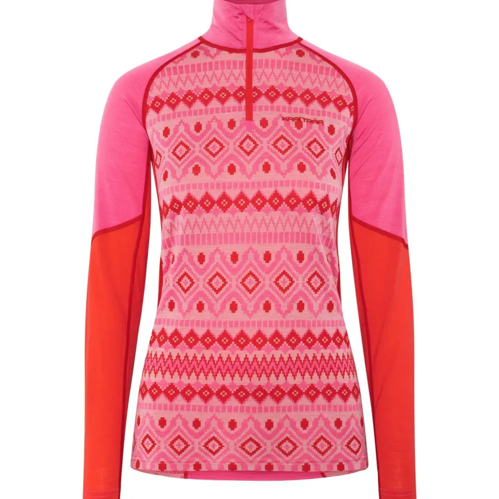 Im coolen Ethnomuster und mit Raglanärmeln präsentiert sich das Women’s Malia Half Zip Longsleeve von Kari Traa!Das Shirt aus dem funktionalen Materialmix eignet sich perfekt für Outdoorausflüge an kalten Tagen. Der hohe Kragen schützt die Hals-, Nackenregion vor Kältewellen und der Reißverschluss lässt bei Bedarf Frischluft rein. Eine unter dem Arm eingesetzte Panel Konstruktion sorgt für viel Bewegungsfreiheit.
