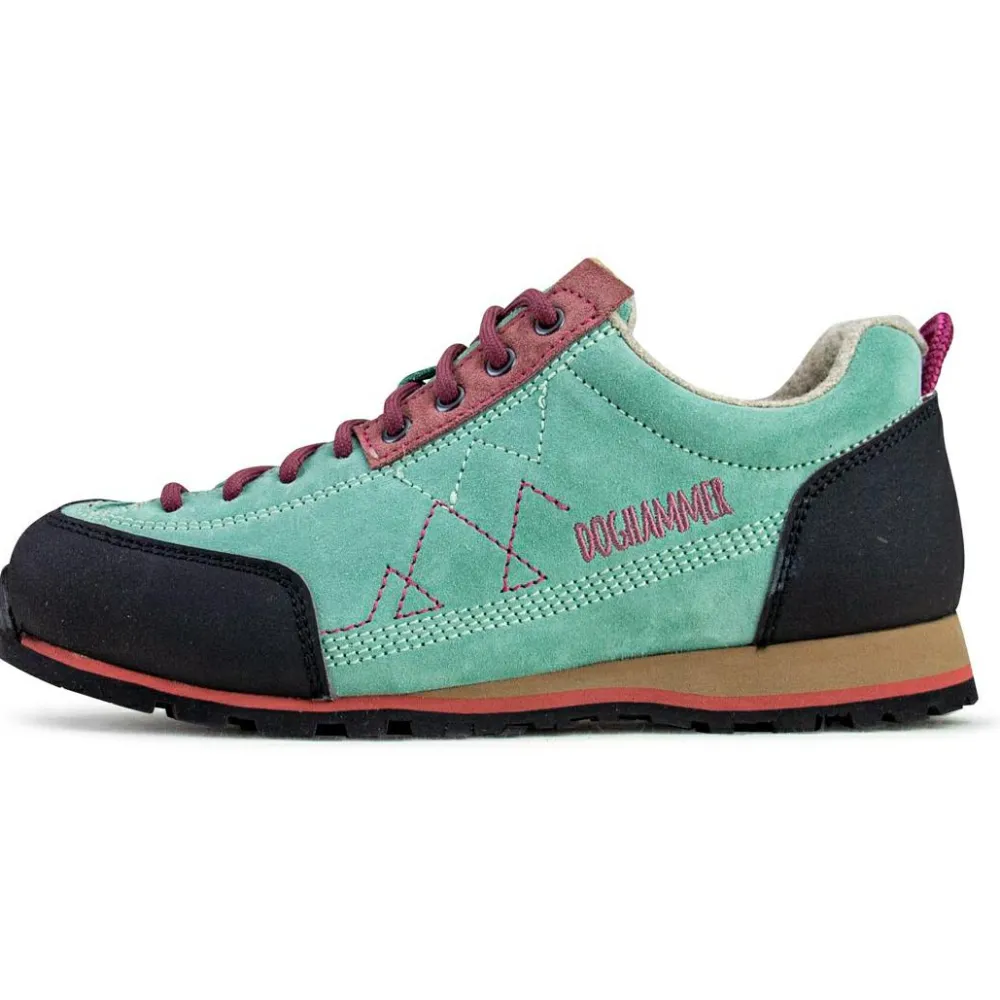 Die halbhohen Women’s Ginja Rock Wool Approachschuhe machen sowohl auf Wanderungen als auch beim Aufstieg zur Kletterwand eine gute Figur. Dank des feuchtigkeitsregulierenden Innenfutters aus Wolle ist für ein gutes Fußklima gesorgt. Die EVA Zwischensohle sorgt dabei in Kombination mit dem Fußbett aus recyceltem Kork für den nötigen Tragekomfort. So kommst Du ausgeruht an der Wand an. Mit den praktischen Anziehschlaufen bieten Dir die Ginja Rock Wool von Doghammer eine einfache Befestigungsmöglichkeit während des Kletterns.