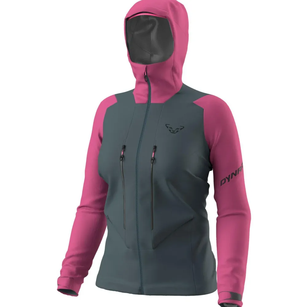 Die geräumigen Fronttaschen der Women’s Blacklight 3L Jacket von Dynafit sind so platziert, dass sie auch beim Tragen eines Klettergurts problemlos zugänglich sind. Dank Reißverschlüssen sind die hier transportierten Gegenstände vor Wetter und Verlust geschützt. Eine helmtaugliche Kapuze schützt auch den Kopfbereich vor Wettereinflüssen.