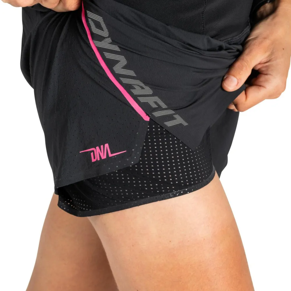Die Women’s DNA 2/1 Split Shorts von Dynafit sind extrem funktionelle und leichte Laufshorts, speziell für’s Trailrunning. Das Material zeichnet sich dadurch aus, dass es schnell trocknet und dank 4-Wege-Stretch unbegrenzte Bewegungsfreiheit garantiert. Die Shorts bestehen aus einer enganliegenden Tight und einer darüberliegenden, lockeren Schicht mit Dynafit Logo und zwei praktischen Taschen. Eine davon ist mit einem Reißverschluss verschließbar und bietet Platz für den Schlüssel, während in der anderen eine kleine Trinkflasche oder eine Ration Powergel untergebracht werden kann.